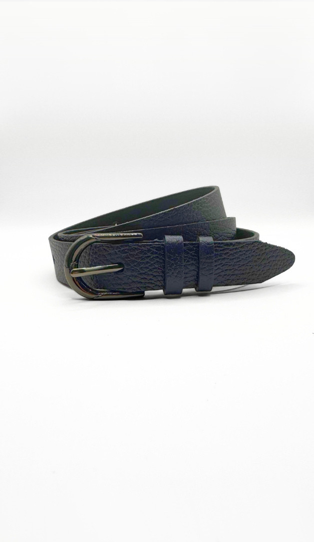 Трендовый женский аксессуар выполнен в минималистическом дизайне и универсальном цвете. Снаружи кожаный ремень темно-синий имеет однотонную рельефную поверхность и дополнен практичной металлической пряжкой. Оригинальное тиснение подчеркивает стиль аксессуара и придает эффектность. Благодаря своей лаконичности, кожаный ремень темно-синий станет удачным дополнением к любому женскому наряду и непременно, подчеркнет изысканный вкус своей обладательницы.