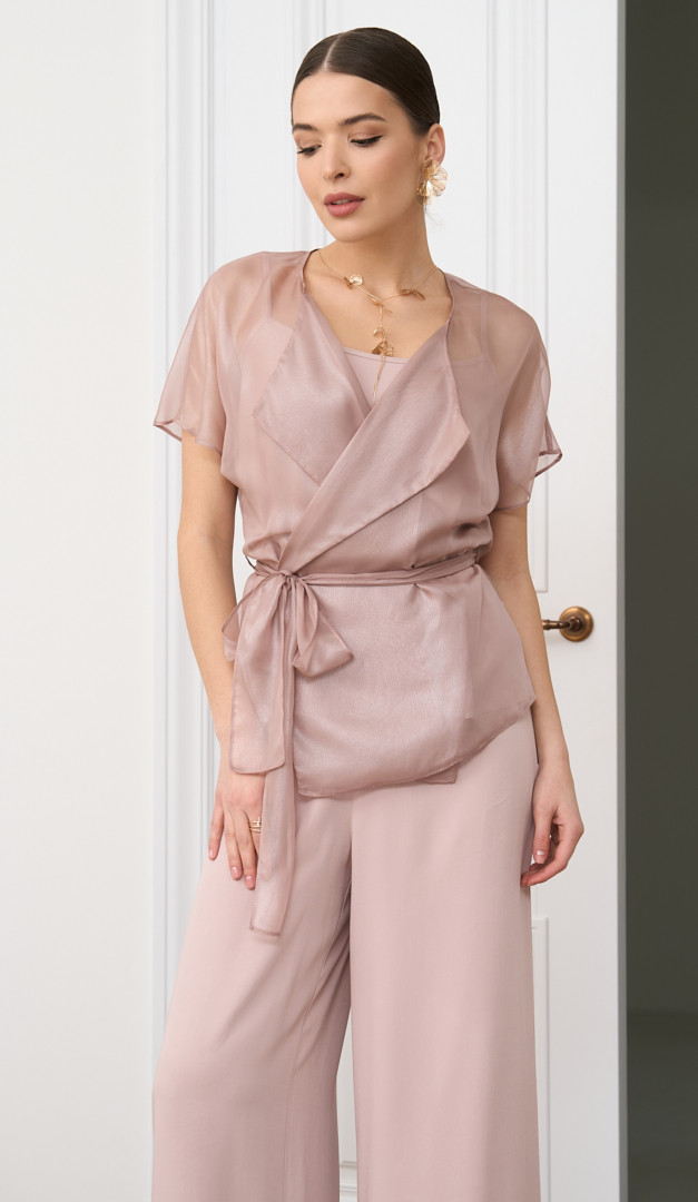 Блуза на запах прозрачная пудровая – стильное дополнение к нежным женственным образам. Модель свободного кроя, с коротким рукавом, прикрывающим линию плеч и широким отложным воротником. Блуза на запах прозрачная пудровая фиксируется на талии с помощью широкого съемного пояса из аналогичной ткани. Легкая прозрачная ткань с эффектом мерцания окутывает силуэт, не отягощая его и дарит ощущение пространства и свободы. Без застежек.