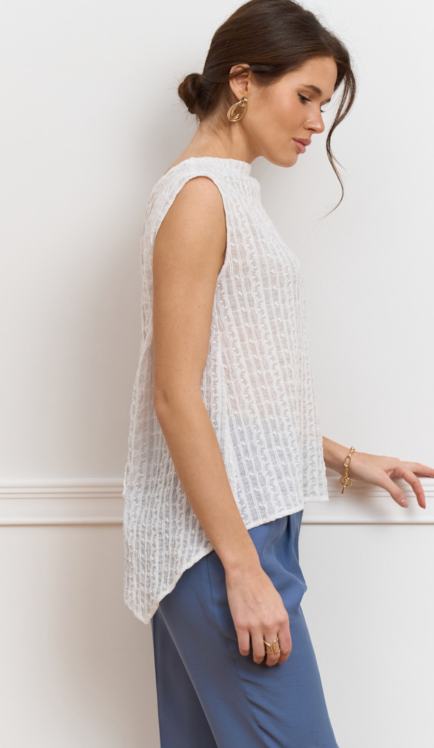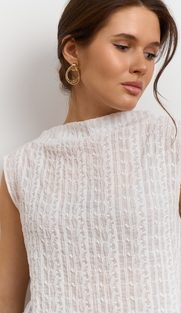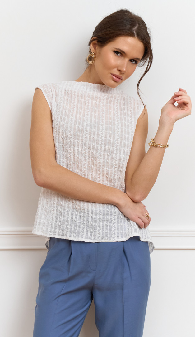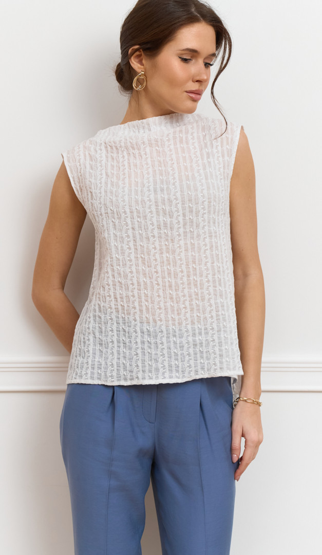Блузон женский ажурный белый – идеальное дополнение к летнему базовому гардеробу. Модель свободного слегка расклешенного вниз кроя. Блузон женский ажурный белый выполнен из легкой натуральной ткани – 100% хлопок, которая обеспечит полный комфорт телу даже в самые жаркие дни. Выразительности изделию добавляет эффект «на запах» сзади, который формирует V-образный вырез на спинке и ее удлиненный фигурный низ. Благодаря универсальному цвету и минималистичному дизайну блузон будет удачно комбинироваться с любым низом.