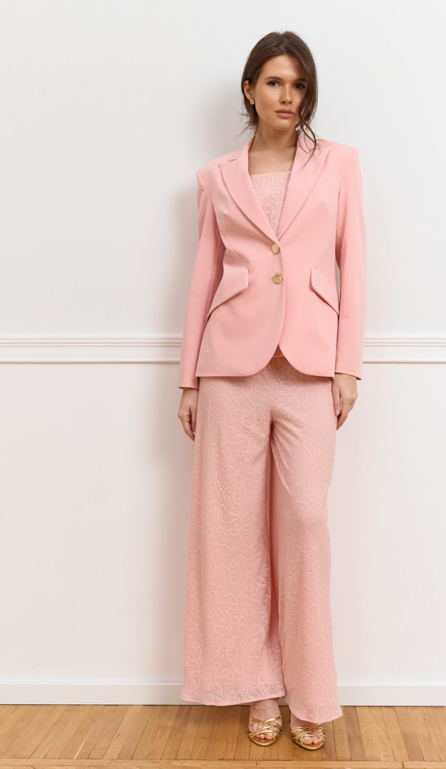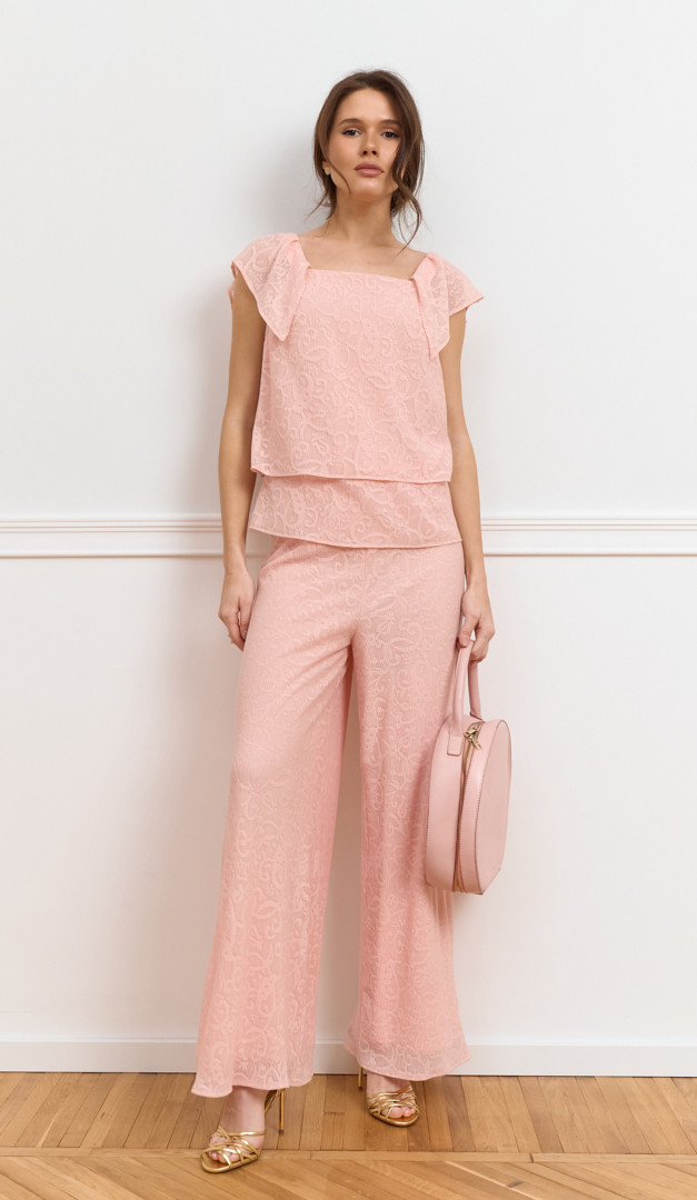 Для создания монохромного образа рекомендуем комбинировать топ с гофре розовыми штанами из аналогичной ткани (арт.2908) и жакетом розовым (арт.4051)..