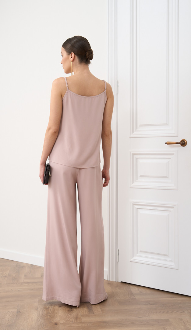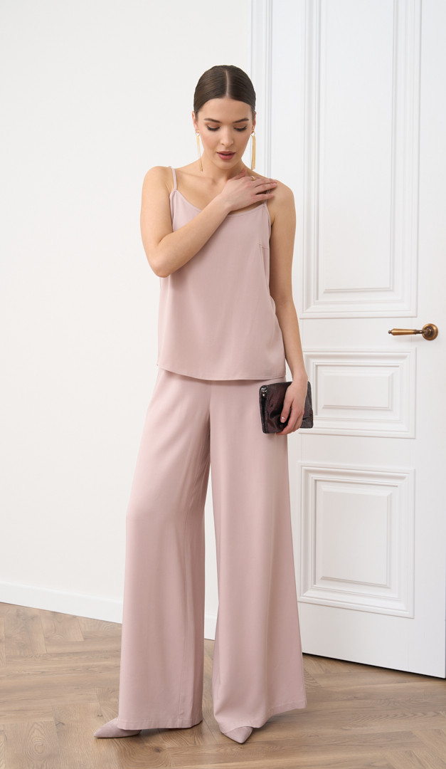 На фото создан образ с топом на бретелях пудровым (арт.2860) и прозрачной блузкой на запах пудровой (арт.4024).