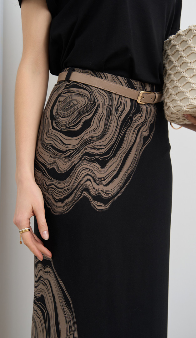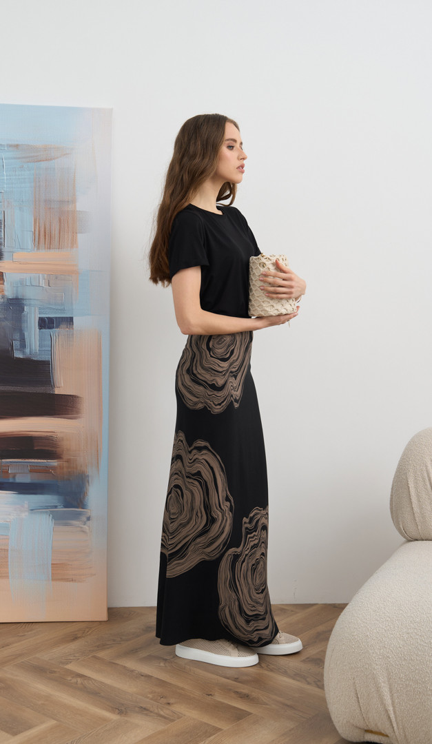 Юбка макси черная с принтом придаст женственности к базовому весенне-летнему гардеробу. Модель слегка расклешенного книзу кроя, с трендовой длиной макси и высокой распоркой ,которая находится в центральном заднем шве. Юбка макси черная с принтом сверху оформлена удобной эластичной резинкой и потайной застежкой на молнию сзади. Стильный контрастный принт придает изделию эффектность. Без подложки.