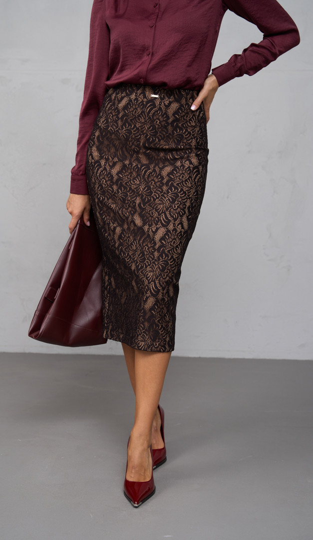 Юбка миди из кружева коричневая — элегантность и изысканность, которые завораживают с первого взгляда. Модель классического прилегающего кроя со средней посадкой по фигуре и элегантной длиной миди. Юбка миди из кружева коричневая на поясе оформлена широкой эластичной резинкой без дополнительных застежек. Эффективности изделию придает контрастная комбинация мягкого трикотажа и роскошной кружевной ткани.