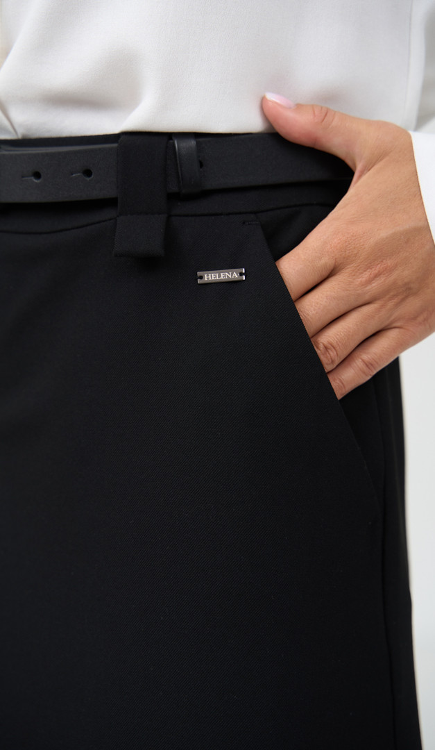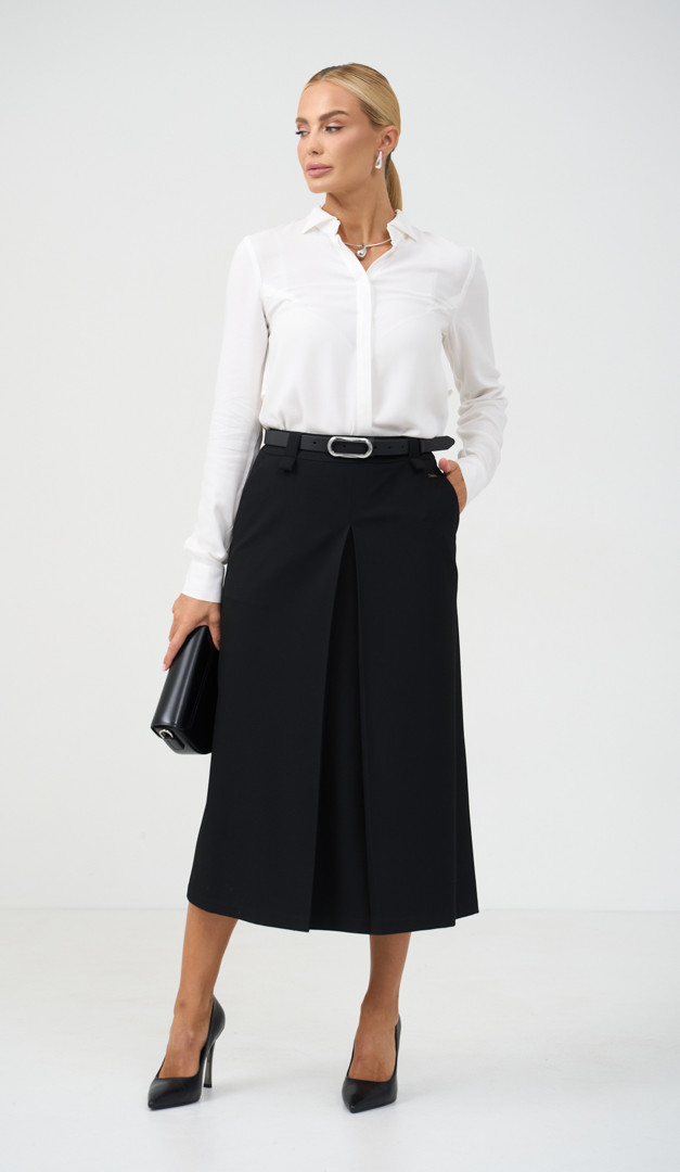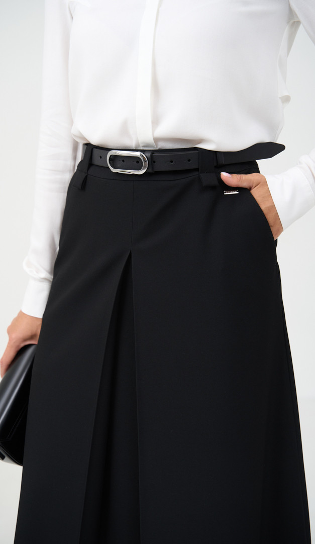 Юбка трапеция миди черная – стильное дополнение к вашему базовому классическому гардеробу. Модель имеет удобный и практичный крой со средней посадкой по фигуре. Эффективности изделию добавляет объемная фигурная складка, расположенная по центру переда модели. Юбка трапеция миди черная имеет функциональные карманы по бокам, обеспечивающие дополнительный комфорт. Изнутри модель оформлена подкладкой и застегивается на молнию, расположенную в среднем шве, сзади.