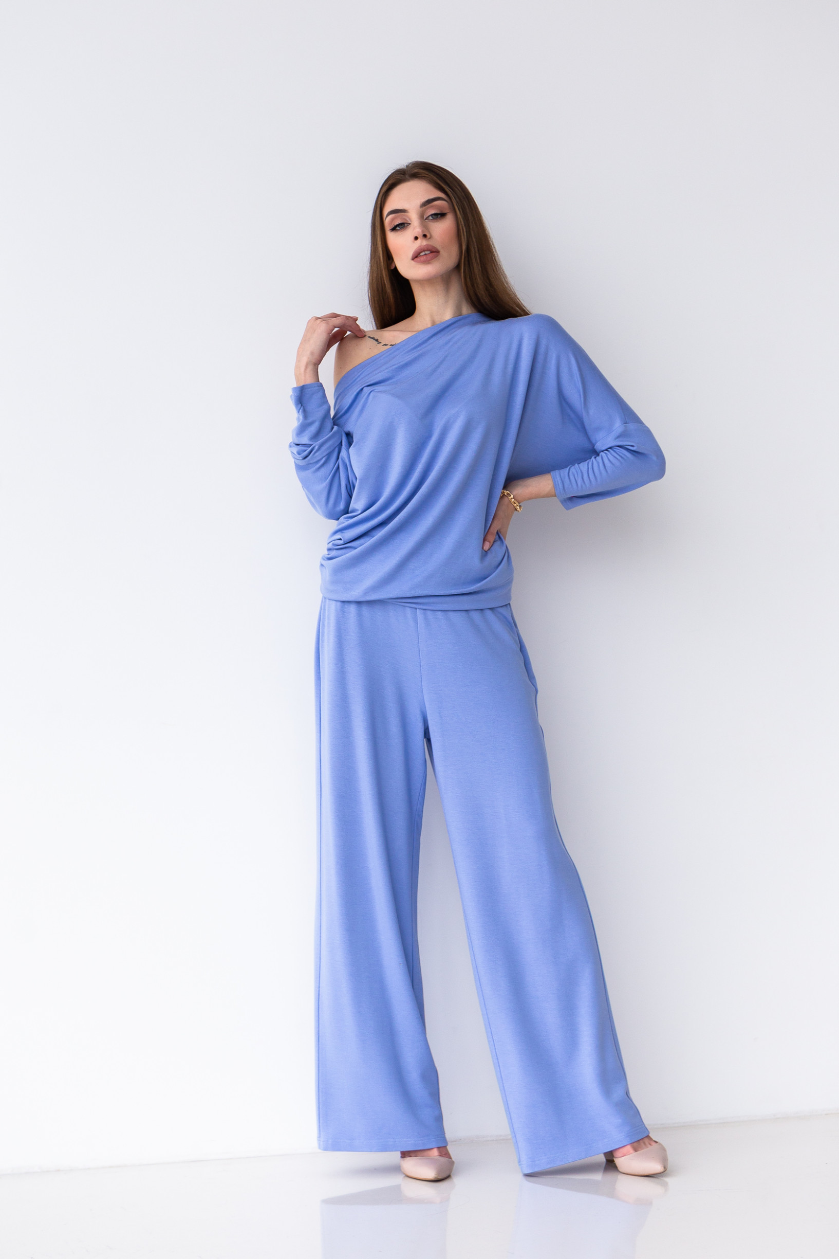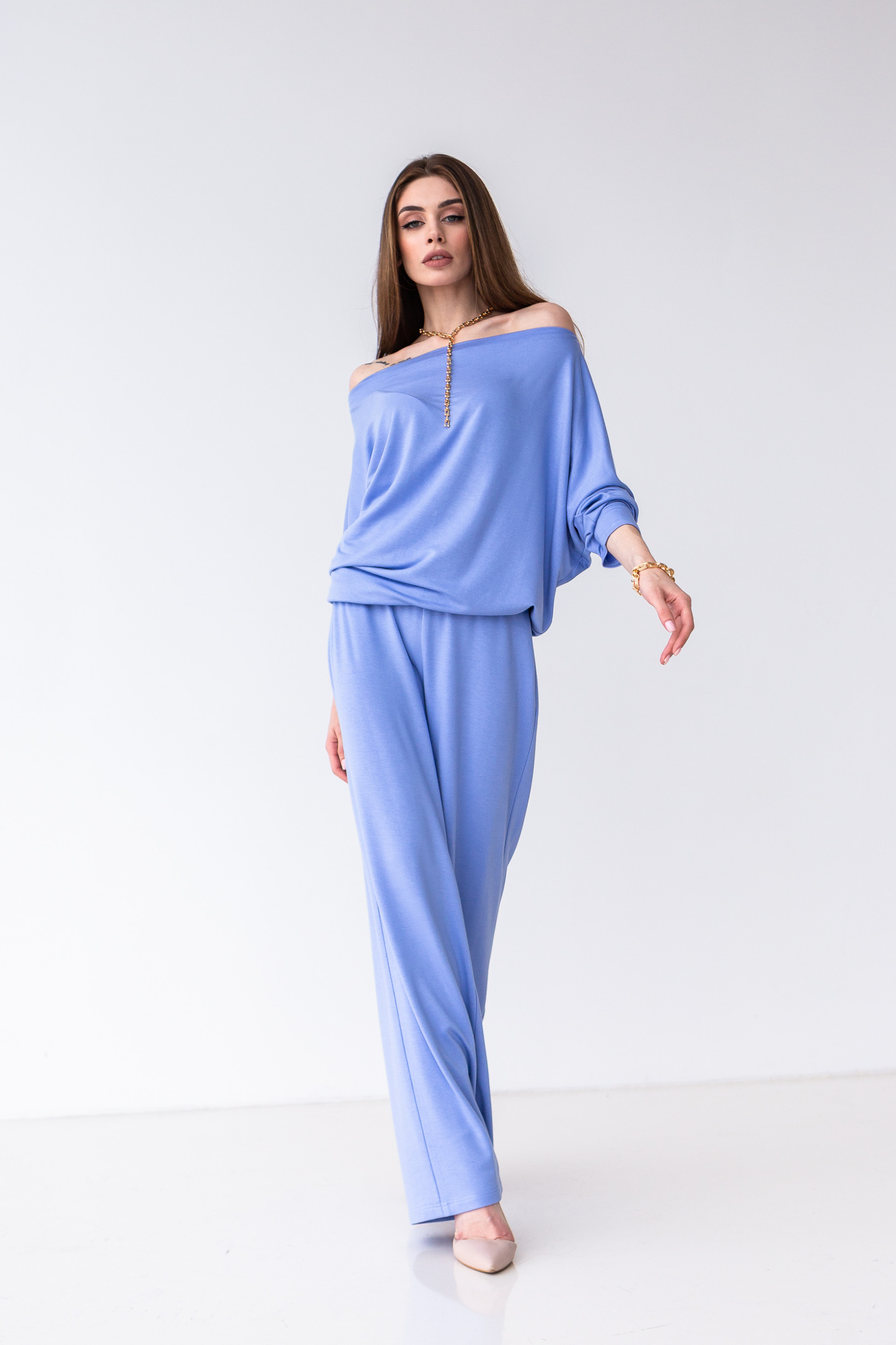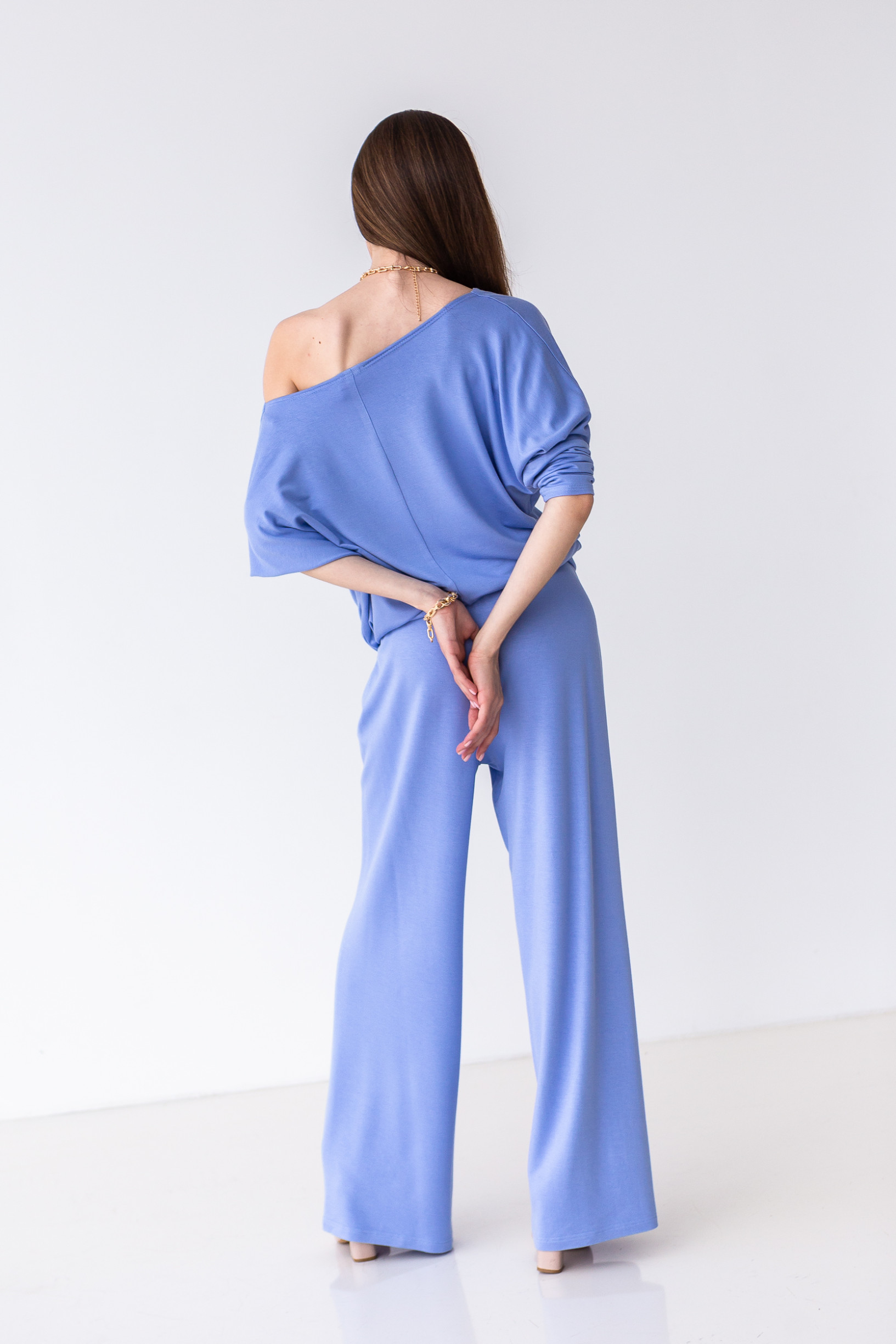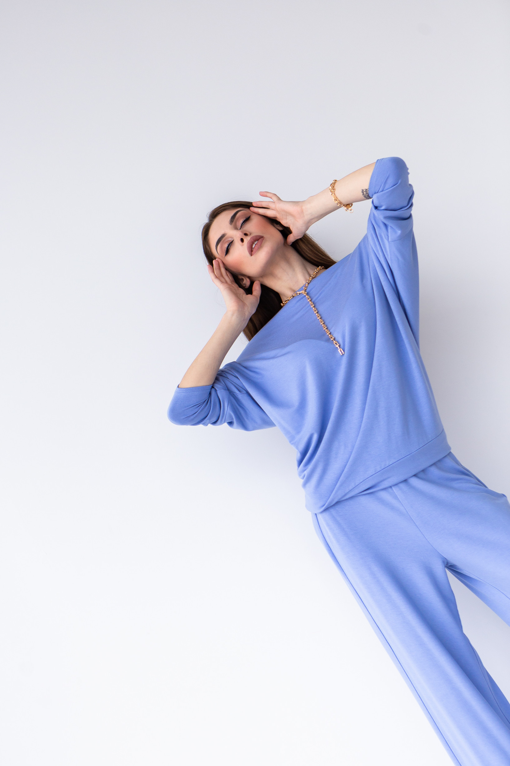 Для создания эффектного образа рекомендуем Вам лавандовый свитшот комбинировать с лавандовыми трикотажными широкими брюками из такой же ткани (1710-0).