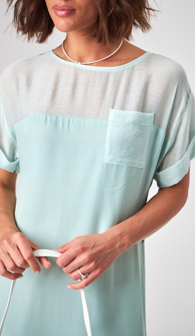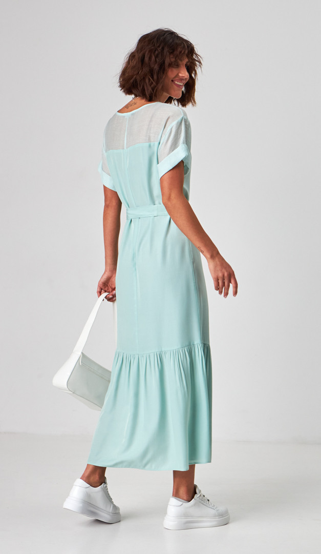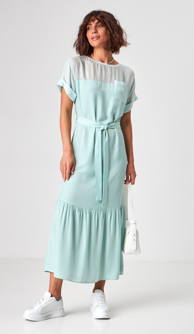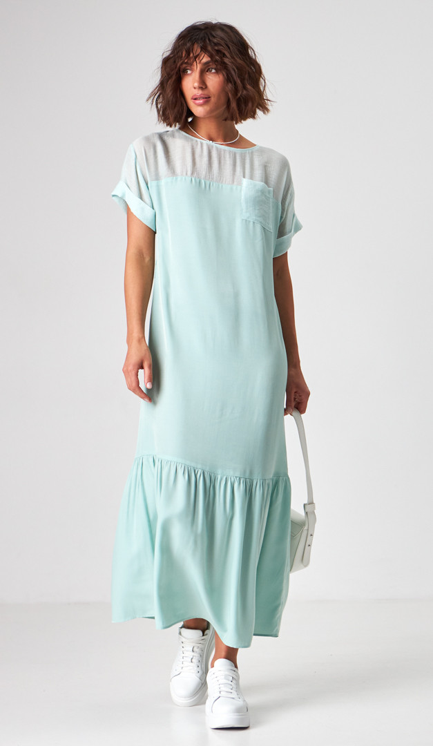 Платье макси мятного цвета создано специально для вас разного и уникального. Ее ведь можно носить как с трендовыми кедами, так и с любимыми босоножками. Модель прямого кроя, с неглубоким вырезом горловины и коротким рукавом, оформленным по краю отворотом. На линии талии, платье макси мятного цвета дополнено поясом, подчеркивающим изящество женского силуэта. А стильный волан по низу, придает образу романтических ноток. Оригинальность изделия придает сочетание двух разнофактурных тканей. Модель без подкладки и застежек.