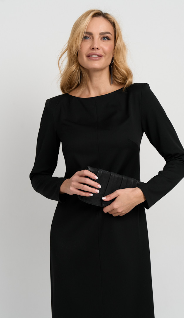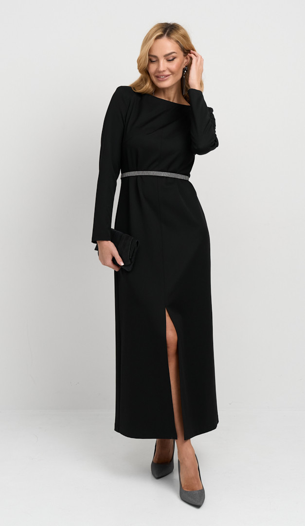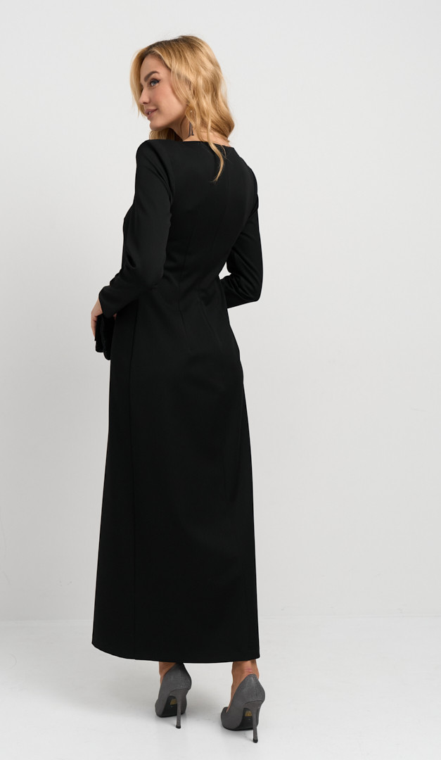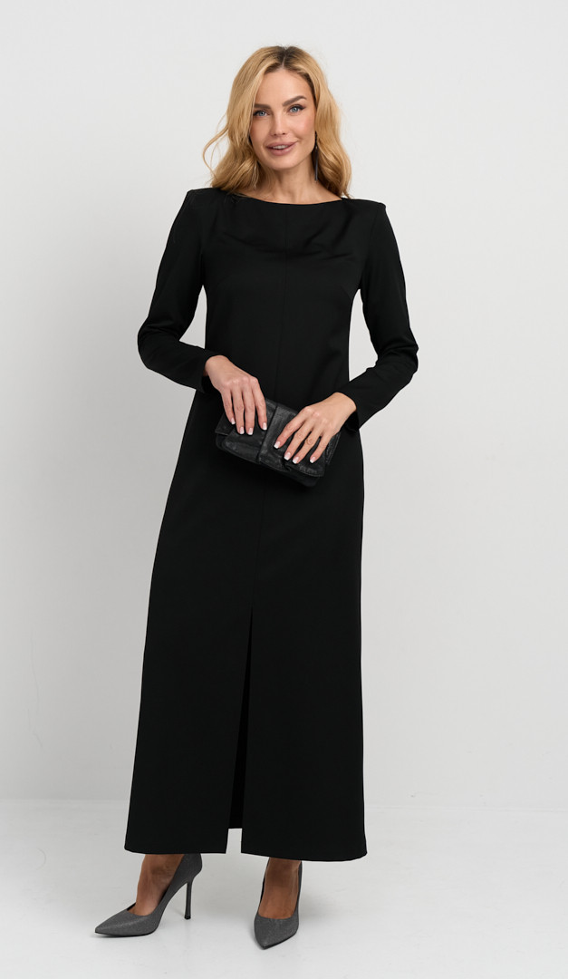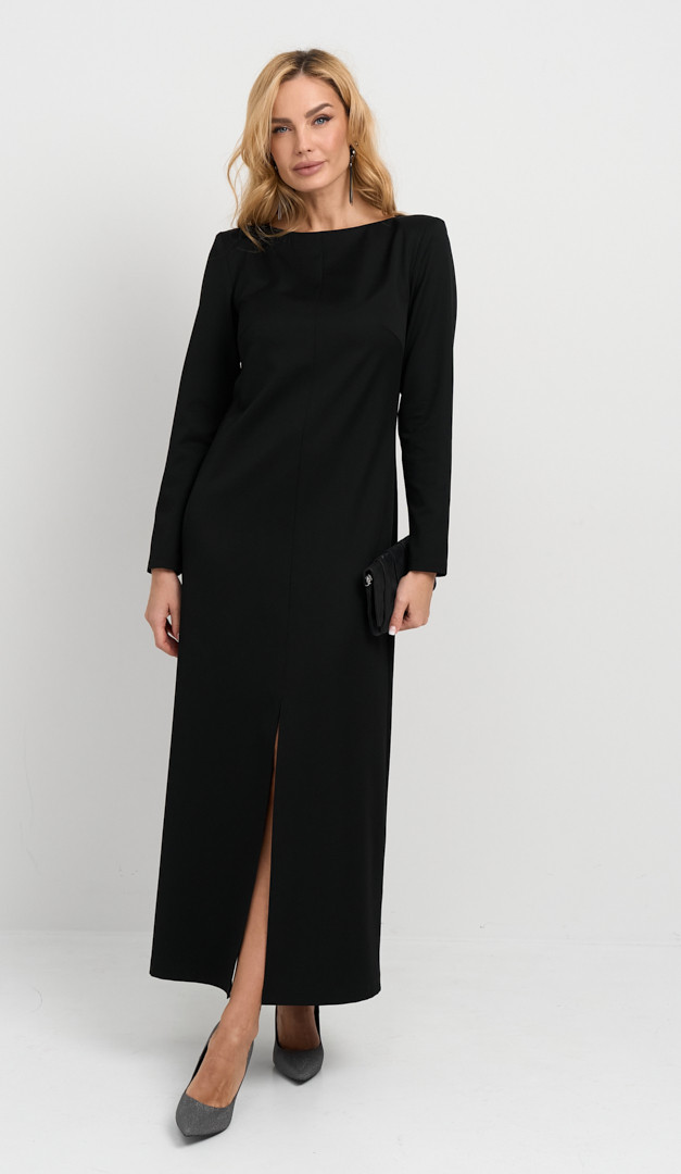 Платье с разрезом макси черное – элегантная базовая вещь в женском гардеробе. Модель имеет легкую трапецию, которая делает женскую фигуру более изящной, с неглубоким округлым вырезом горловины, длинным рукавом и трендовой длиной макси. Платье с разрезом макси черное застегивается на потайную молнию расположенную в центральном заднем шве. Для создания более утонченного силуэта изделие дополнено тонкими плечевыми накладками, а высокий разрез по центру переда подчеркивает женственность созданного образа. Без подкладки.