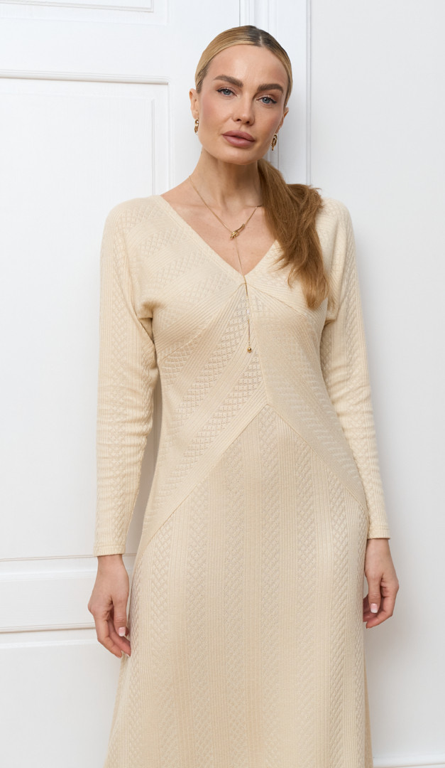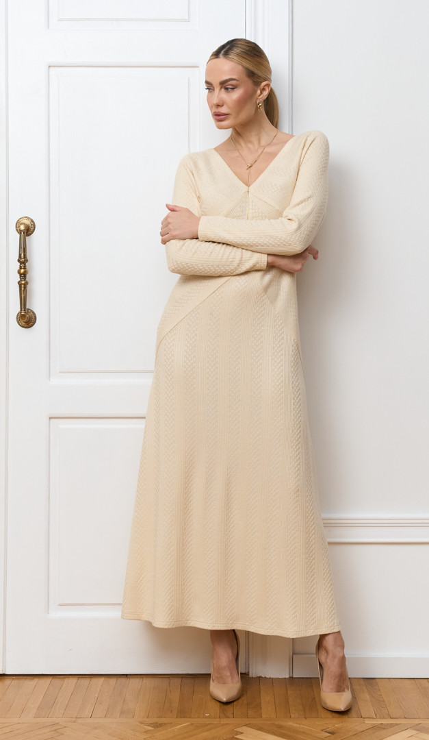 Платье трикотажное с узором сливочное – нежное дополнение к базовому женскому гардеробу. Модель универсального расклешенного внизу кроя, с длинным зауженным рукавом и элегантной длиной макси. Платье трикотажное с узором сливочное имеет неглубокий симметричный V-образный вырез горловины и спинки, что придает женскому силуэту выразительность. Изделие выполнено из приятного к телу трикотажа средней плотности с рельефным узором.