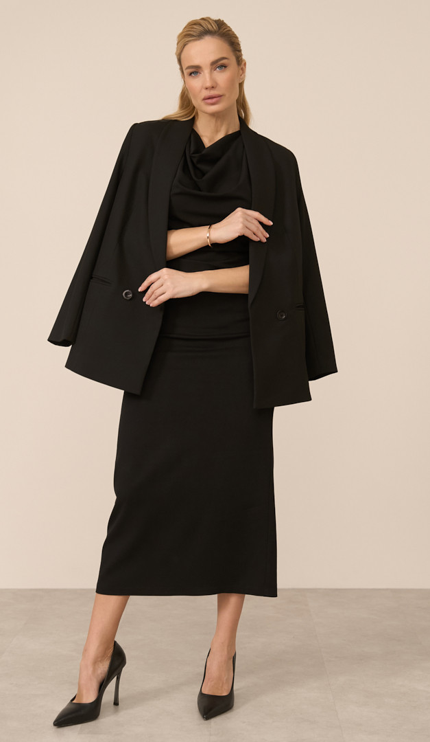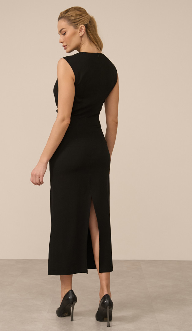 Сарафан футляр черный – универсальный выбор для базового женского гардероба. Модель приталенного кроя, с округлой горловиной, которая переходит в объемную драпировку, создавая стильный акцент. Сарафан футляр черный застегивается на потайную молнию, расположенную в заднем центральном шве и выполненный из ткани в составе которой 80% вискозы, которая обеспечивает комфорт. Черный цвет придает изящество женскому силуэту и позволяет легко комбинировать изделие с разными аксессуарами и обувью. А длина миди и высокий разрез сзади подчеркивают фигуру и придают женственности. Идеально подходит для офиса, вечерних прогулок или деловых встреч. Без подкладки.