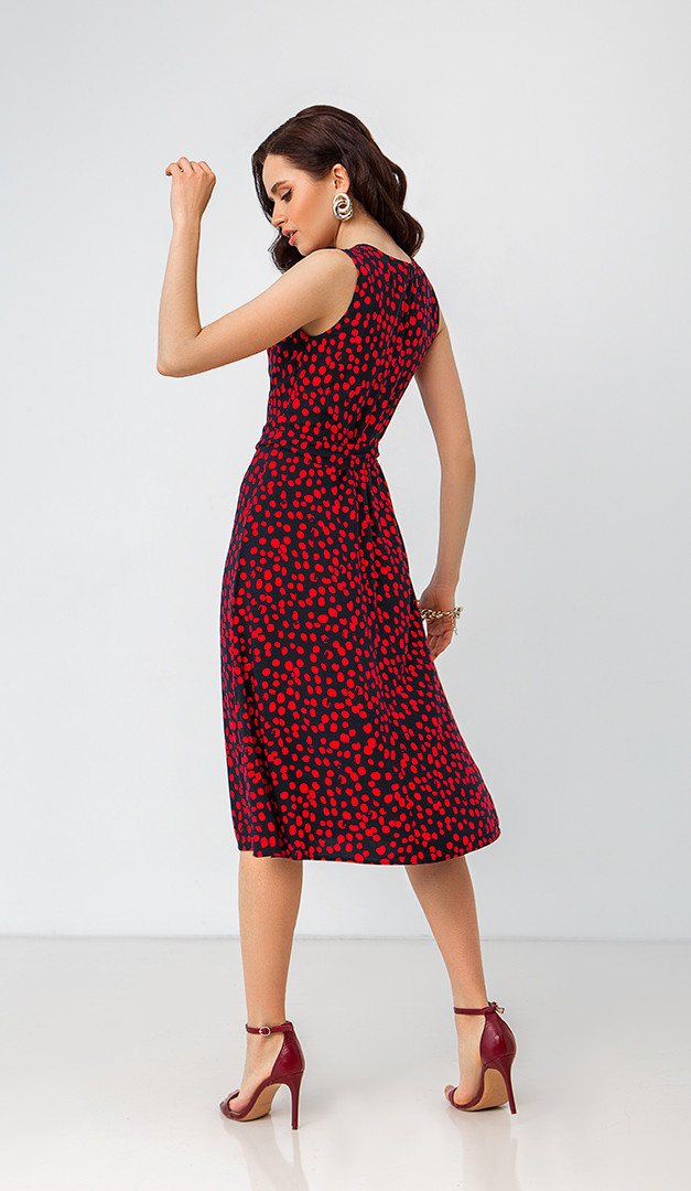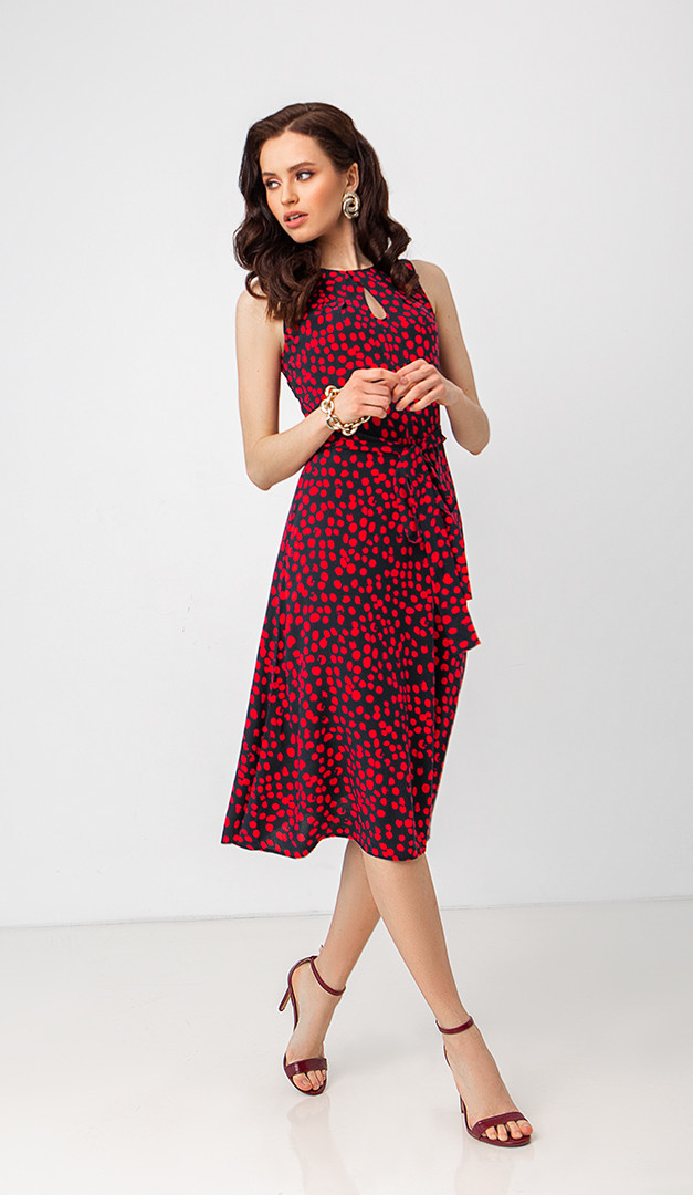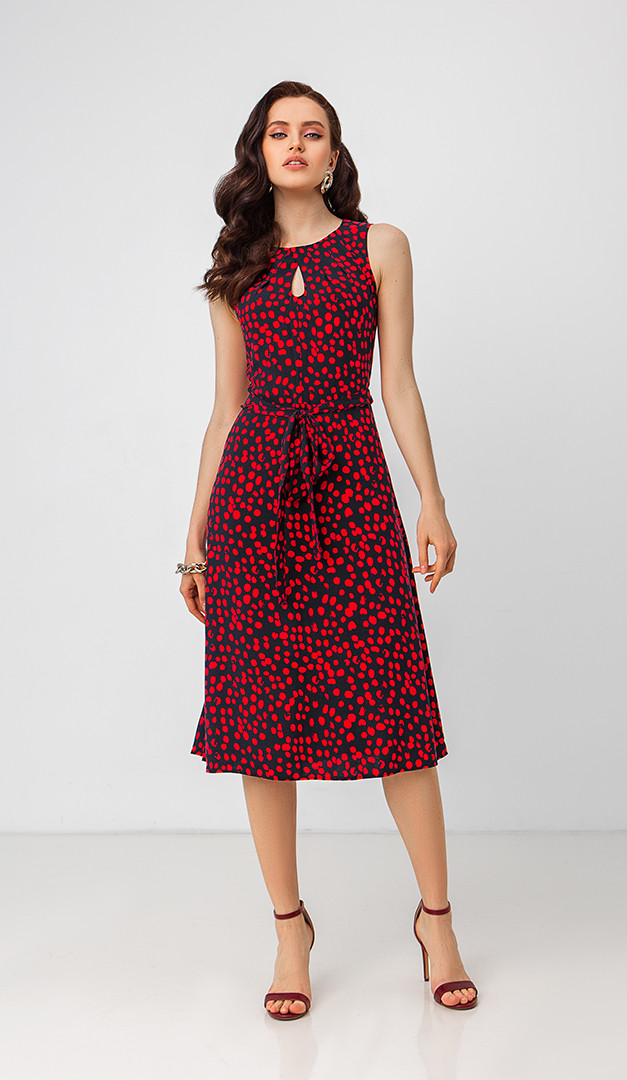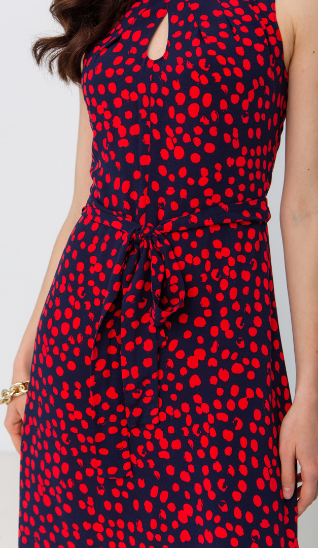 Летний синий сарафан в красный горох выполнен в романтичном стиле, который с лёгкостью преобразит каждую модницу. Сарафан имеет женственный А-силуэт с отрезной линией талии и кокетливо расклешенным низом. Минималистичный верх летнего сарафана украшен декоративными защипами и аккуратным вырезом-«капелька». Линия талия подчеркнута поясом из аналогичной ткани. Элегантная длина «миди» придаст вашему образу нарядных ноток, а силуэту — дополнительной стройности. Сарафан застёгивается на застёжку- «молнию» в среднем шве задней части. Без подкладки.