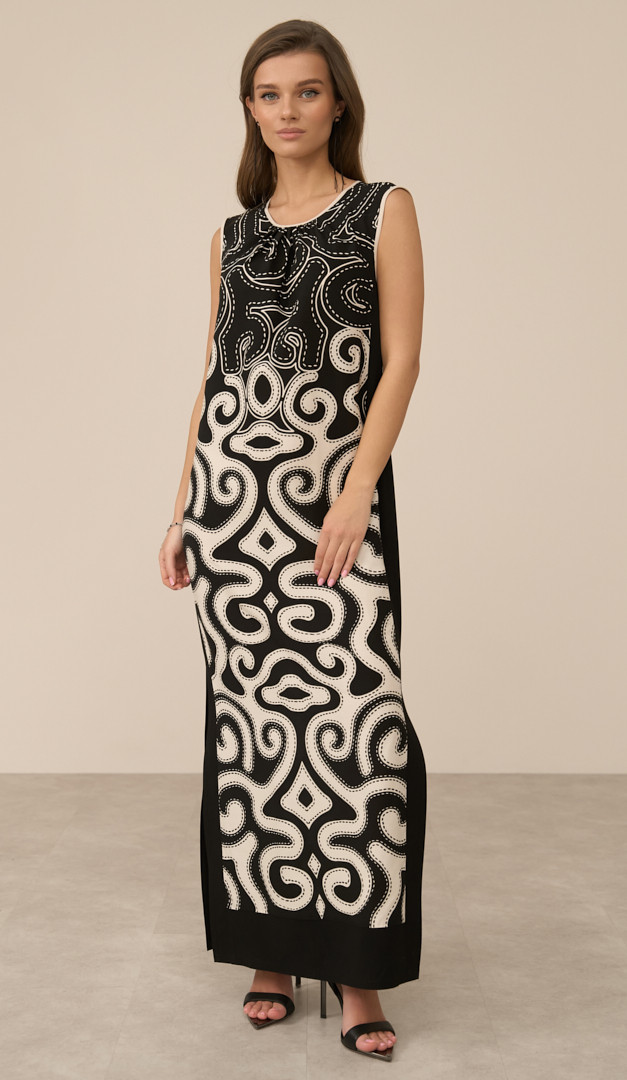 Для создания непринужденного и стильного образа выбирайте сарафан макси молочно-черный. Модель прямого кроя, с неглубоким вырезом горловины и трендовой длиной макси. Сарафан макси молочно-черный выполнен из натуральной ткани – вискоза 100%, которая обеспечит комфорт телу при любой температуре. Контрастный принт придает изделию эффектность, а высокие разрезы по бокам создают особую динамику подчеркивая женственность и грацию. Сзади модель завязывается на тонкую шнуровку и имеет неглубокий вырез на спинке. Без подкладки.