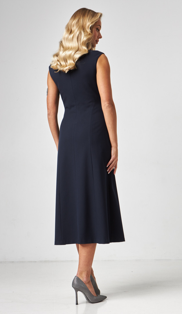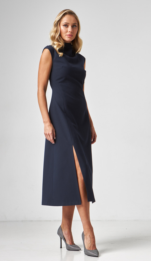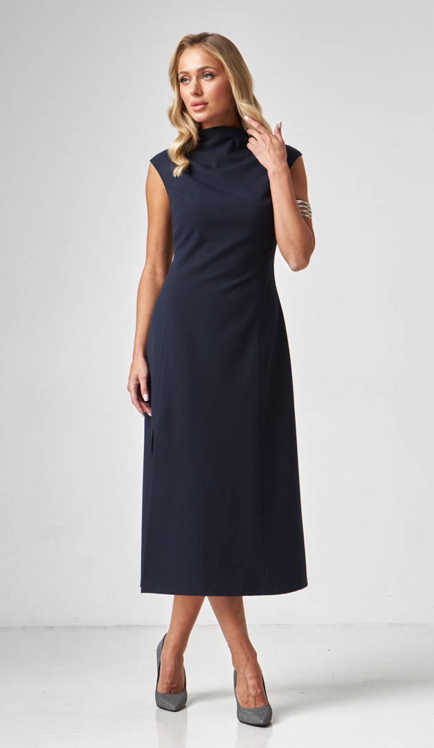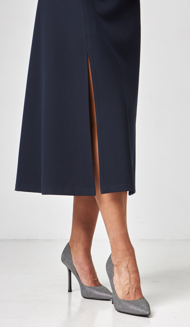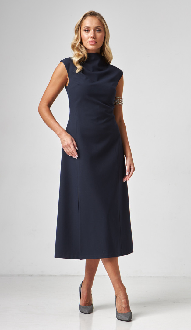 Сарафан миди классический синий – стильное дополнение к вашему деловому гардеробу. Модель практичного А-силуэта, с элегантной длиной миди и невысокой горловиной-стойкой. Благодаря высокой асимметричной распорке снизу переда, сарафан миди классический синий имеет оригинальный и одновременно трендовый вид. В среднем шве задней части изделие имеет удобную застежку на "молнию". Создавайте ежедневно стильные образы, комбинируя сарафан миди классический синий с разнообразными блузками, гольфами и жакетами. Модель на подкладке.