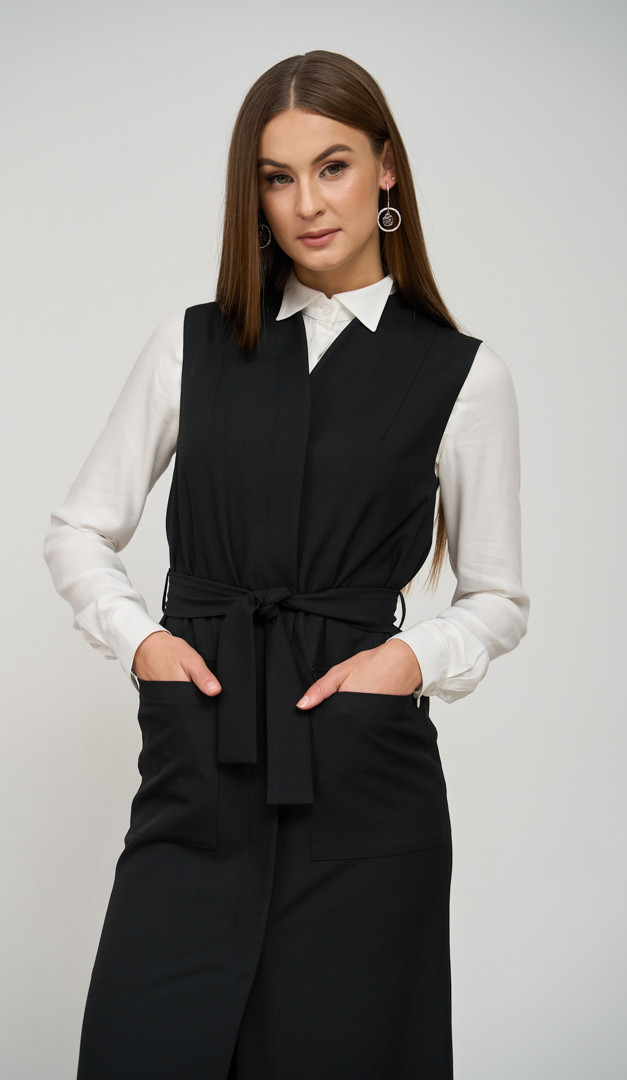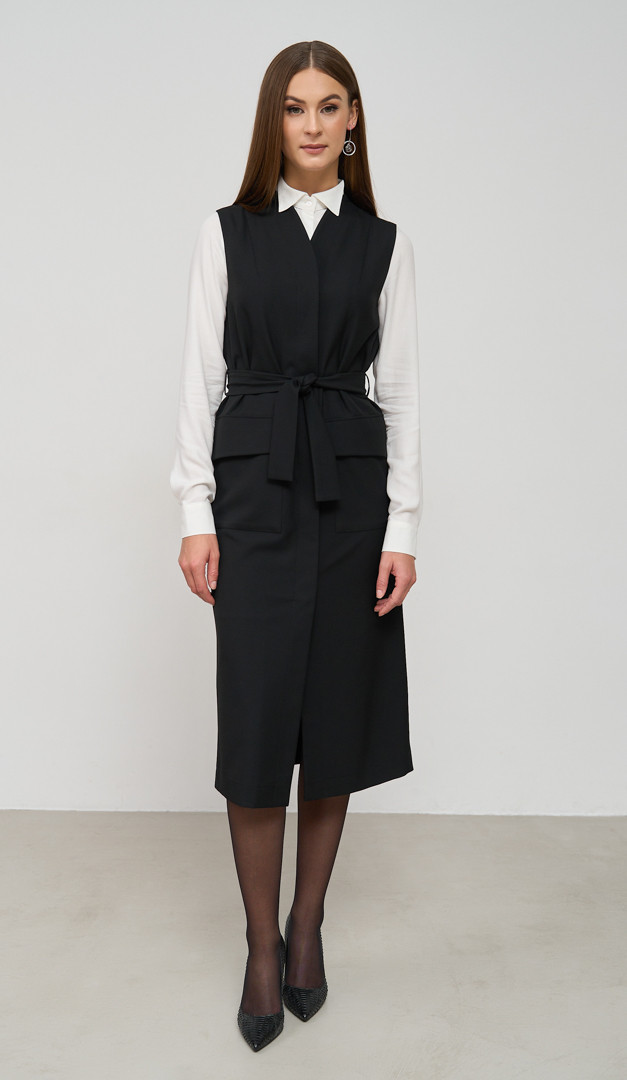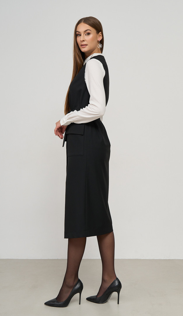 Сарафан с накладными карманами черный станет идеальным решением для создания элегантных деловых образов. Модель свободного прямого кроя, с неглубоким V-образным вырезом горловины, переходящим в функциональную потайную планку-застежку на пуговицы. Сарафан с накладными карманами черный имеет трендовую длину миди и съемный широкий пояс из аналогичной ткани. Оригинальный акцент изделия – объемные накладные карманы с клапанами, придающие практичность и удобство. Дополнить лук с сарафаном в зависимости от сезона можно классическими блузками или базовыми гольфами. На подкладке.