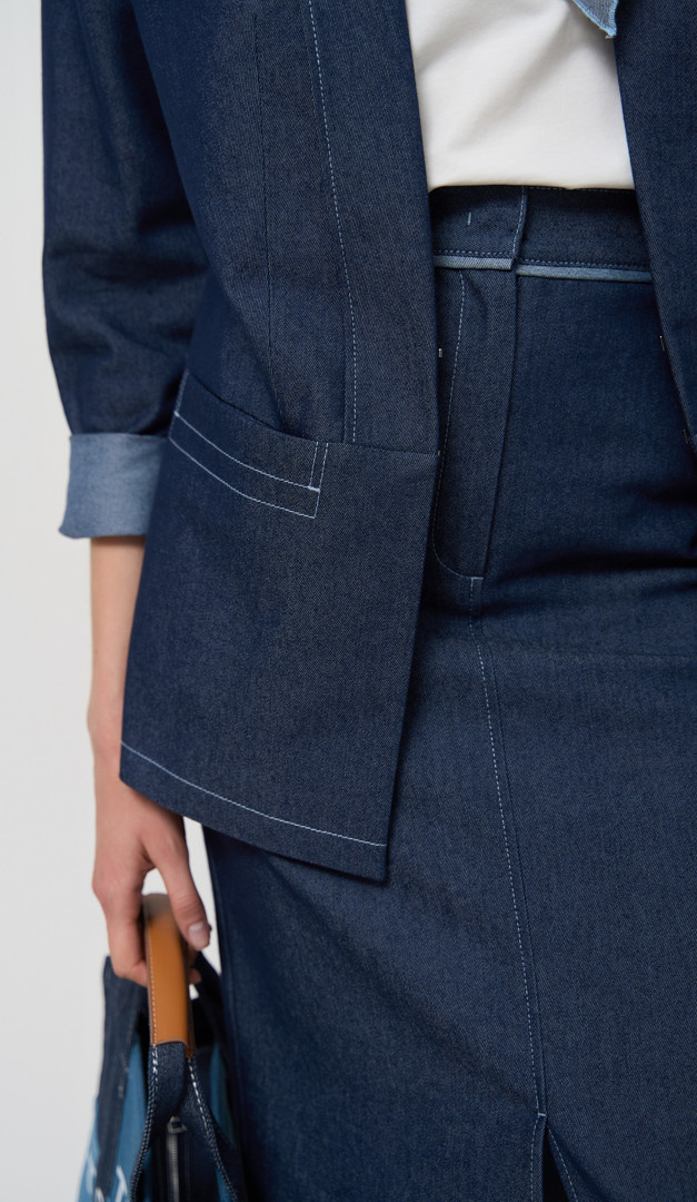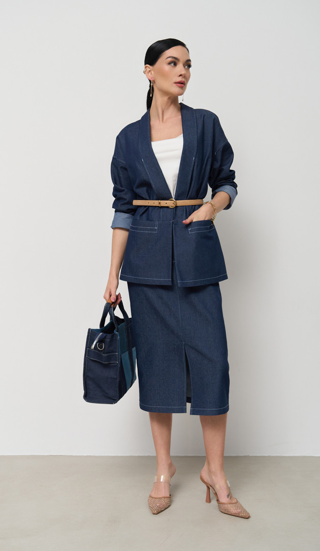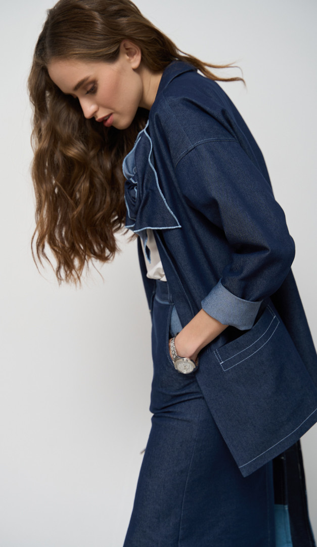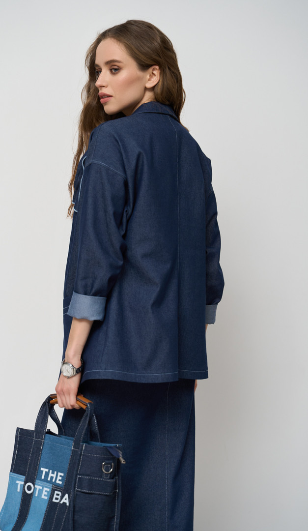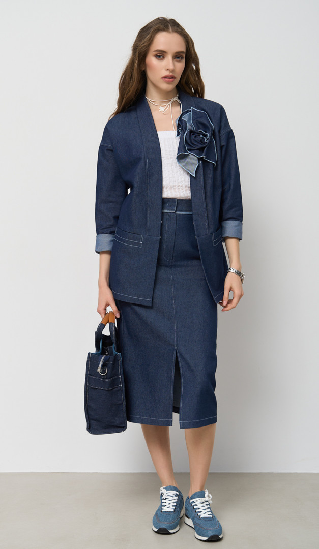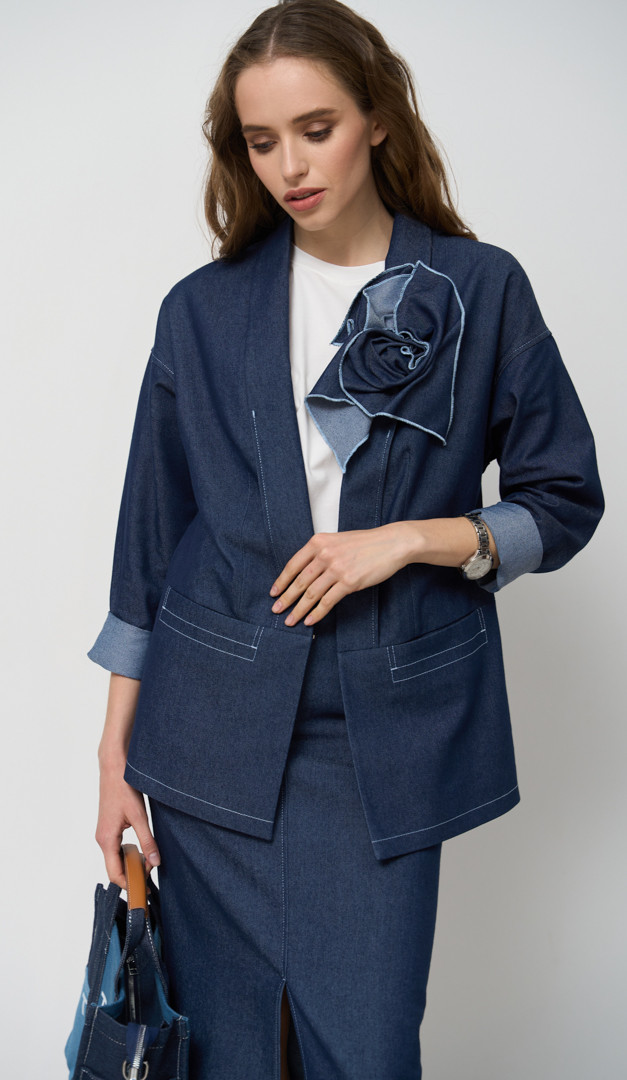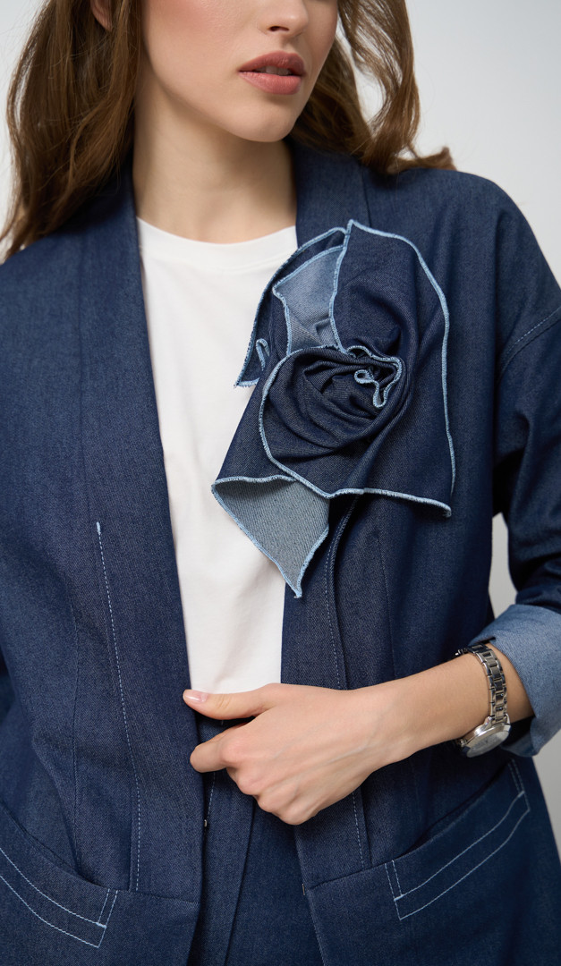 Джинсовый жакет прямой — стильное и удобное дополнение к женскому гардеробу. Модель свободного прямого кроя с удлиненной линией плеча и длинным рукавом, который по желанию можно стилизовать подогнув к локтю. Жакет джинсовый прямой имеет глубокий V-образный вырез, оформленный аккуратным шалевым воротником и застежку на два крючка. Вместительные прорезные карманы с имитацией "рамки" добавляют изделию практичности. Эффектная изюминка модели — съемное объемное украшение в виде цветка, выполненное из аналогичной ткани. Без подкладки.