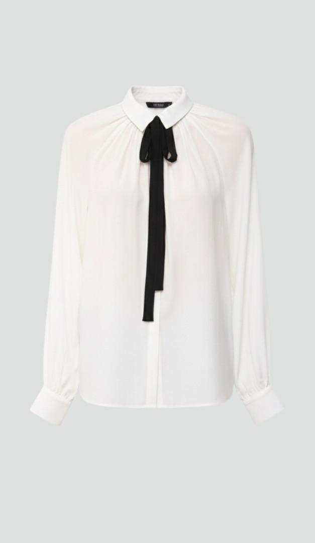 Блузка женская реглан свободного кроя молочная — неотъемлемый элемент базового корпоративного гардероба. Модель свободного прямого кроя, с практичным отложным воротником-стойкой, переходящий в потайную планку-застежку на пуговицы. Блузка женская реглан свободного кроя молочная имеет длинный объемный рукав с манжетой, застегивающаяся на одну декоративную пуговицу. Выразительного акцента изделия добавляет съемная контрастная лента, которая украшает горловину, а мелкие складки формируют изящный красивый силуэт.