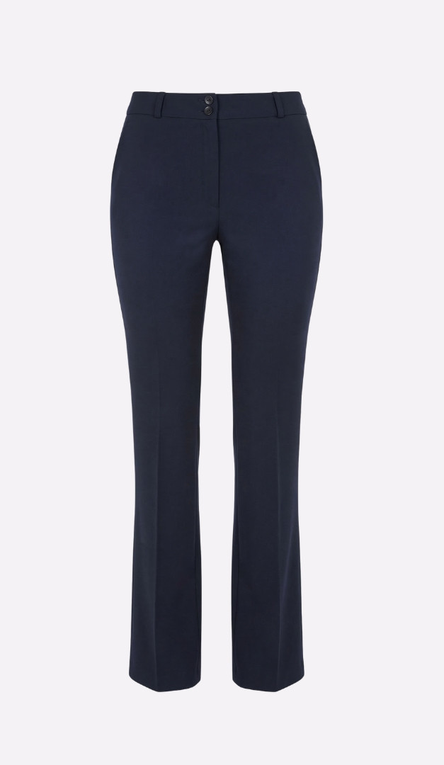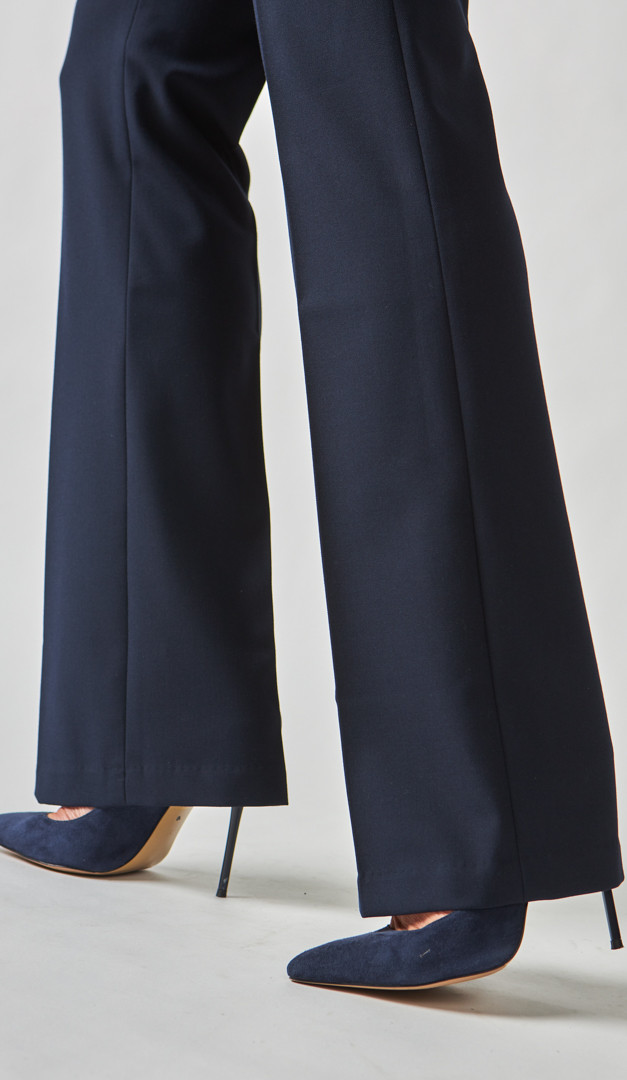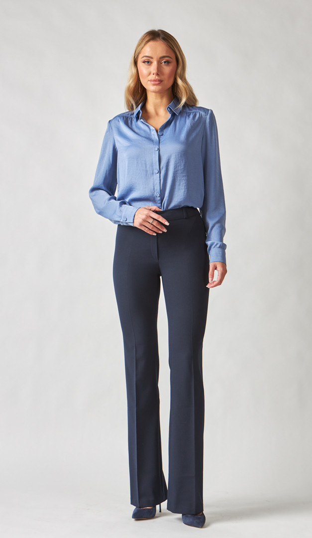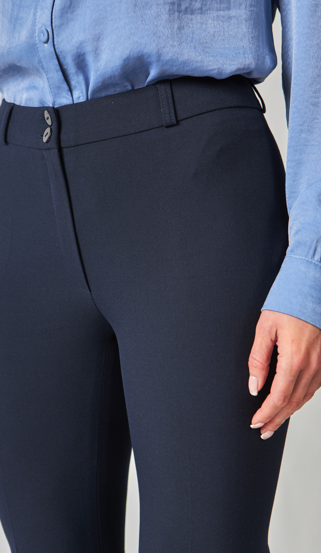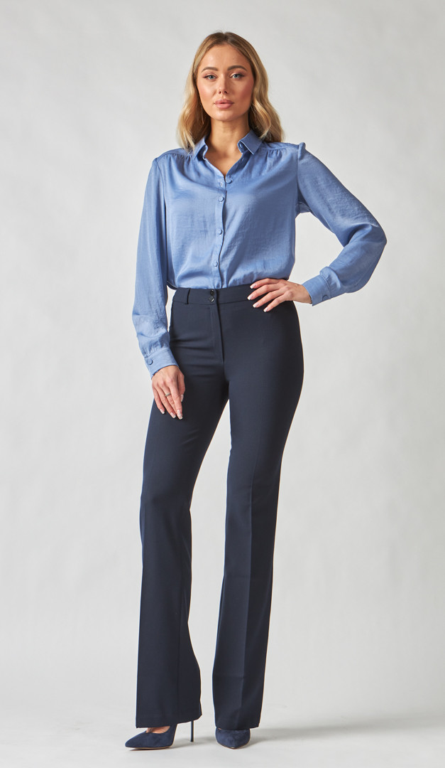 Брюки женские клеш синие – незаменимая база для создания корпоративных деловых образов. Модель со средней посадкой, прямого слегка расклешенного вниз кроя и нешироким поясом с застежкой на две пуговицы и молнию. Прилегающий верх и элегантно заглаженные стрелки подчеркивают стройность женского силуэта и придают ему привлекательность. Благодаря своей универсальности брюки женские клеш синие можно удачно комбинировать с любой блузкой, гольфом или джемпером. Модель без подкладки.
