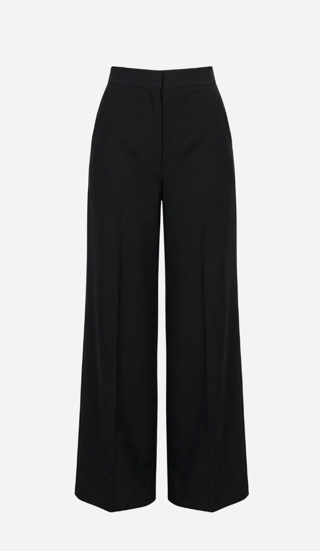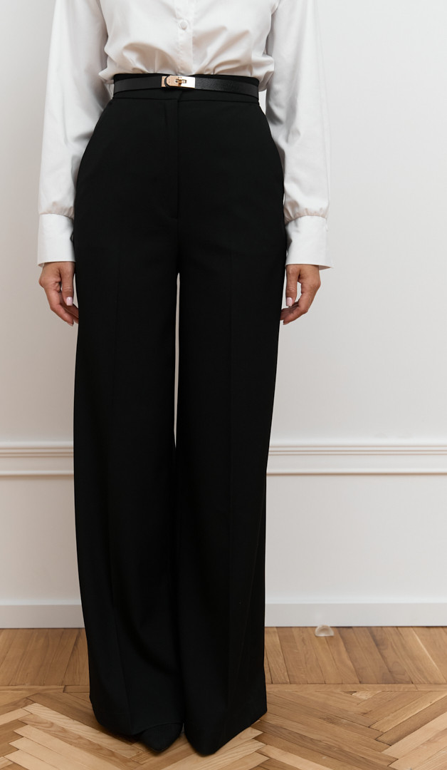 Брюки женские палаццо с карманами черные – базовая вещь в женском гардеробе, для создания стильных образов. Модель имеет среднюю посадку по фигуре, прямой свободный крой и два практичных кармана по бокам. Брюки женские палаццо с карманами черные застегиваются на «молнию», две крючки и пуговицу. Заглаженные стрелки придадут силуэту стройности, а универсальный классический цвет будет удачно комбинироваться с любым верхом. Без подкладки.