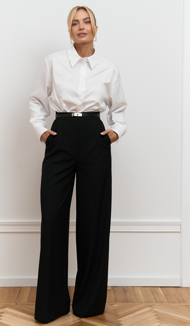 На фото создан лук с брюками и блузкой базовой белой (арт.4068) и однобортным жакетом черным (арт.4071).