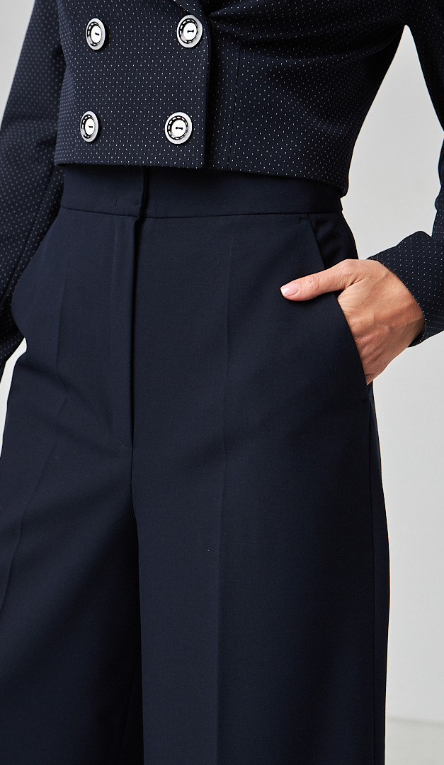 Брюки женские палаццо с карманами синие – базовая вещь в женском гардеробе, для создания стильных образов. Модель имеет среднюю посадку по фигуре, прямой свободный крой и два практичных кармана по бокам. Брюки женские палаццо с карманами синие застегиваются на «молнию», две крючки и пуговицу. Заглаженные стрелки придадут силуэту стройности, а универсальный классический цвет будет удачно комбинироваться с любым верхом. Без подкладки.