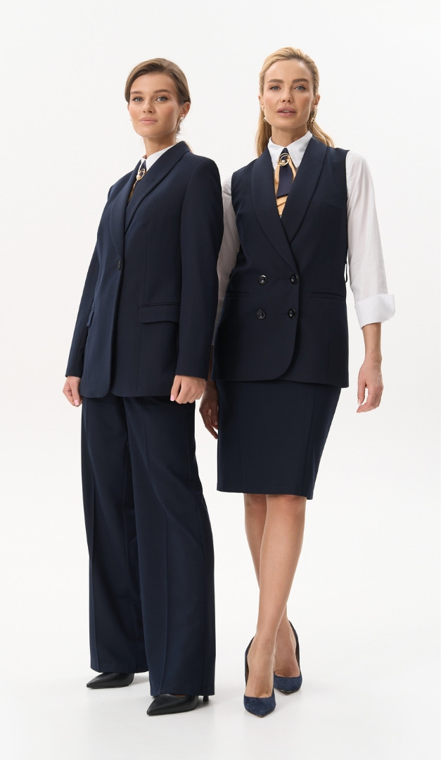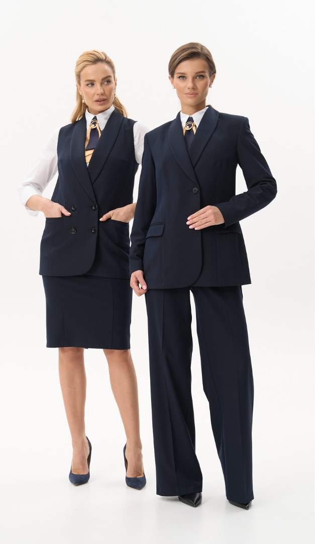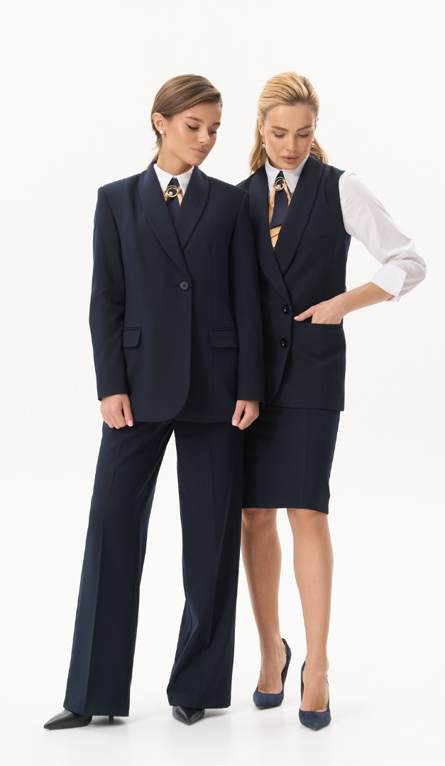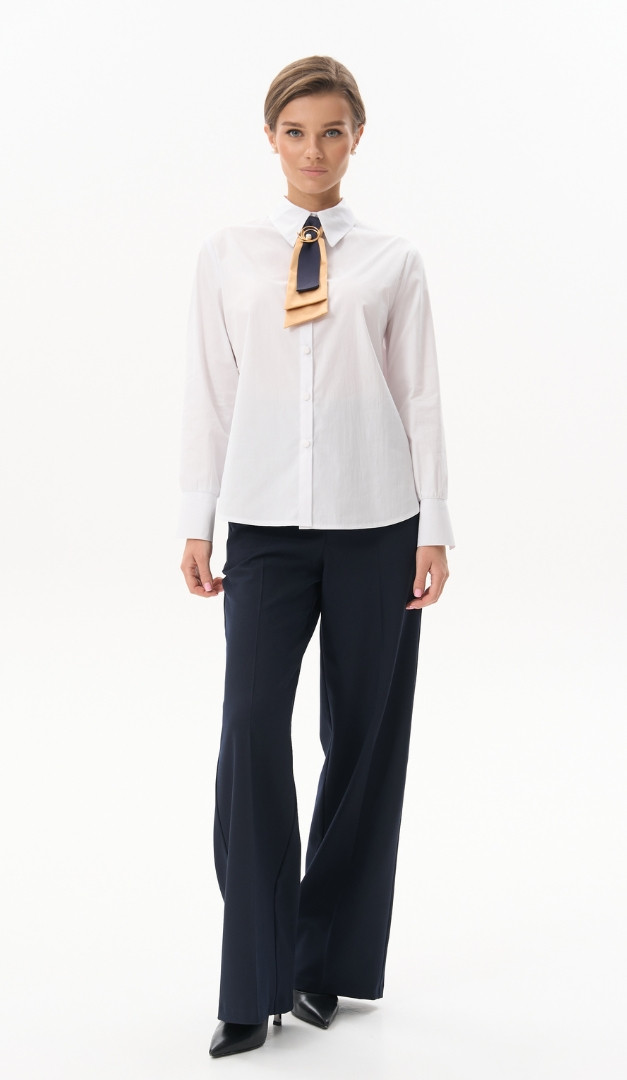 На фото создан лук с блузкой базовой белой (арт.4068) и жакетом с шалевым воротником синим (арт.4057).