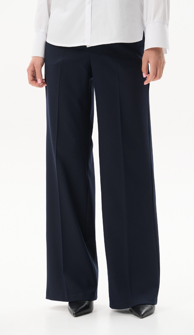 Брюки женские прямые базовые синие станут удачным решением для создания стильных образов. Модель имеет высокую посадку по фигуре, прямой свободный крой и два практичных кармана по бокам. Брюки прямые базовые синие застегиваются на молнию, одна крючка и пуговица. Заглаженные стрелки подчеркивают стройность силуэта, а универсальный классический цвет удачно комбинируется с любым верхом. Пояс модели сзади дополнен небольшой эластичной резинкой. Без подкладки.