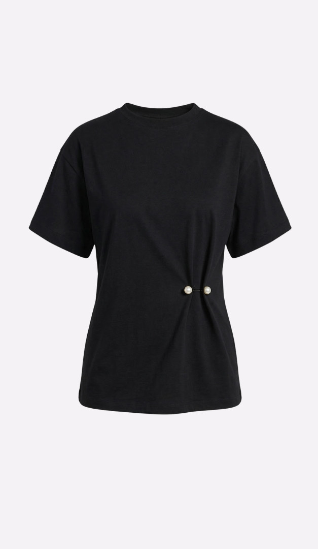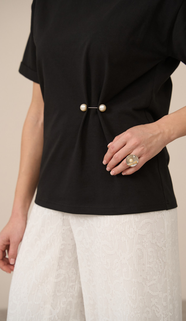 Футболка женская базовая из хлопка черная станет удачным выбором для корпоративных образов. Модель прямого свободного кроя, с округлым закрытым вырезом горловины. Футболка женская базовая из хлопка черная имеет короткий свободный рукав с небольшим отворотом. Съемное украшение с жемчужинами придает изделию оригинальность и лаконичность.