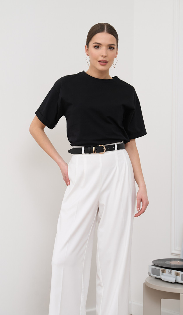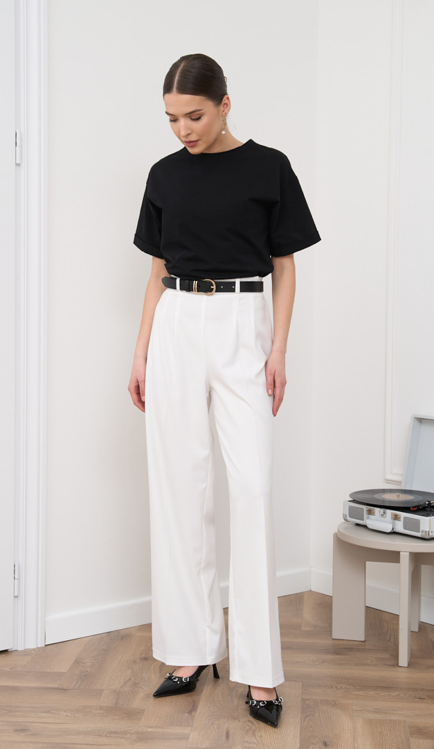 На фото создан образ с брюками гофре молочными (арт.2845) и штанами прямыми молочными (арт.2639).