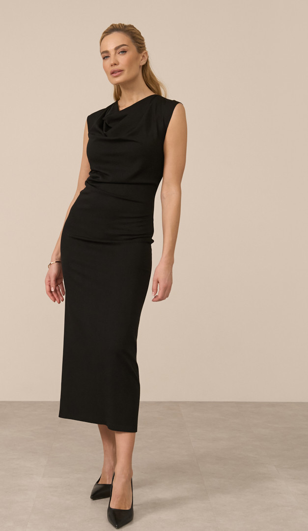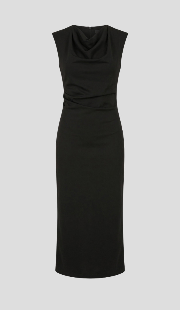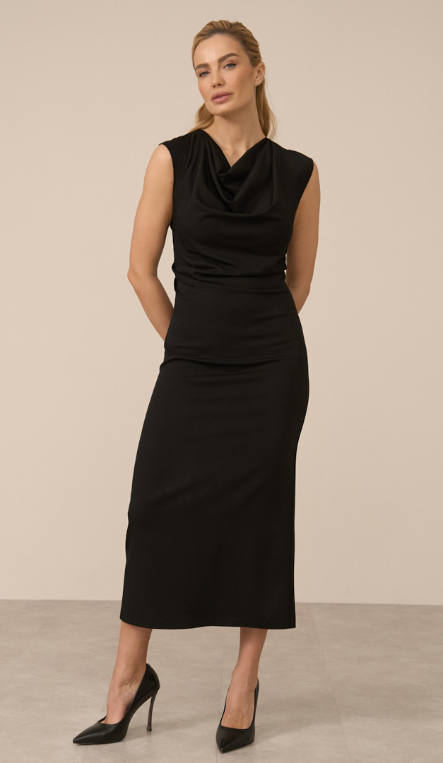 Сарафан футляр женский черный — универсальный выбор для базового корпоративного гардероба. Модель приталенного кроя, с округлой горловиной, которая переходит в объемную драпировку, создавая стильный акцент. Сарафан футляр женский черный застегивается на потайную молнию, расположенную в заднем центральном шве и выполненный из ткани в составе которой 80% вискозы, которая обеспечивает комфорт. Черный цвет придает изящество женскому силуэту и позволяет легко комбинировать изделие с разными блузками, жакетами и обувью. А длина миди и высокий разрез сзади подчеркивают фигуру и придают женственности. Без подкладки.