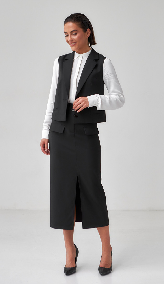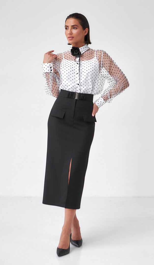 На фото создан образ с прозрачной блузкой в горох с топом (арт.2392), рубашкой с кокеткой (арт.4097) и жилетом прямым черным (арт.4076).