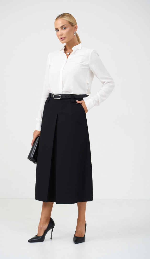 Юбка трапеция с карманами черная – стильное дополнение к базовому классическому гардеробу. Модель имеет удобный и практичный крой со средней посадкой по фигуре. Эффективности изделию добавляет объемная фигурная складка, расположенная по центру переда модели. Юбка трапеция с карманами черная имеет функциональные карманы по бокам, обеспечивающие дополнительный комфорт. Изнутри модель оформлена подкладкой и застегивается на молнию, расположенную в среднем шве, сзади.