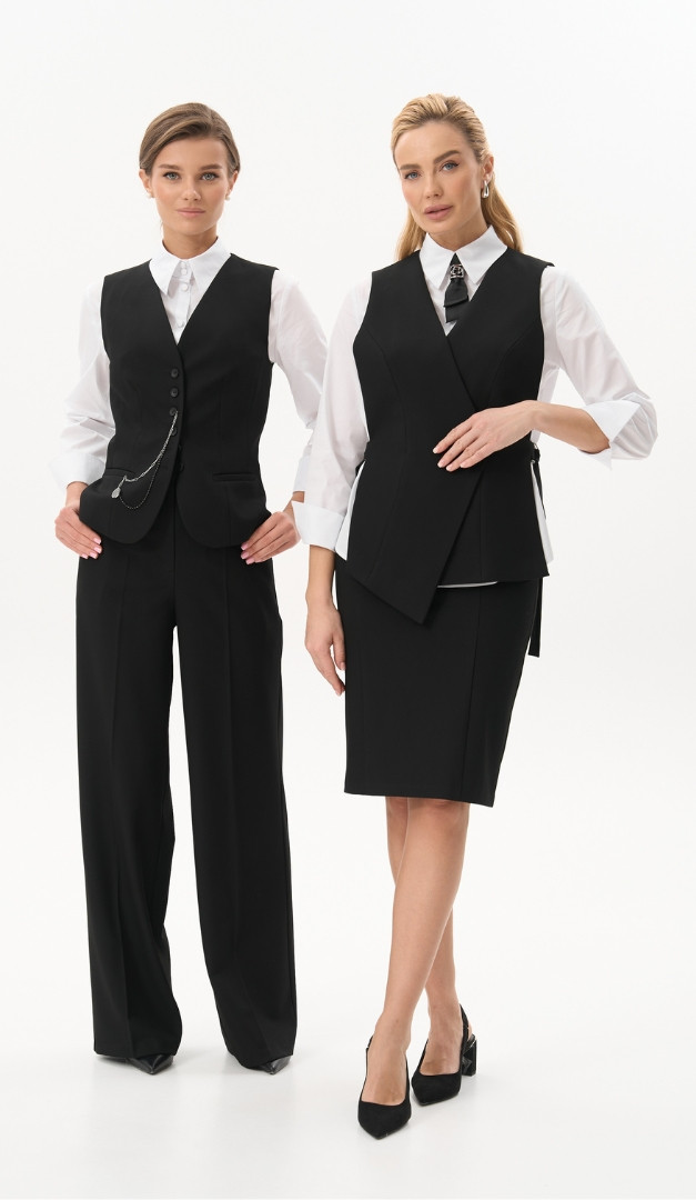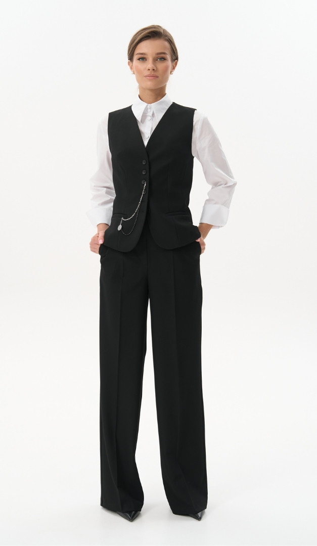 На фото созданы луки с брюками базовыми прямыми черными (арт.4065) и блузкой базовой белой (арт.4068).