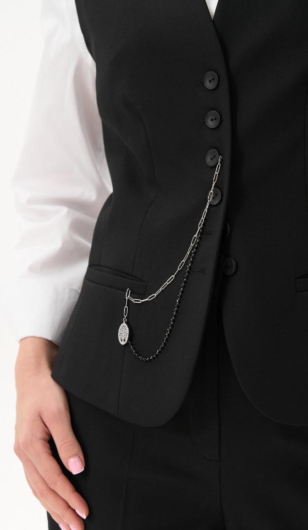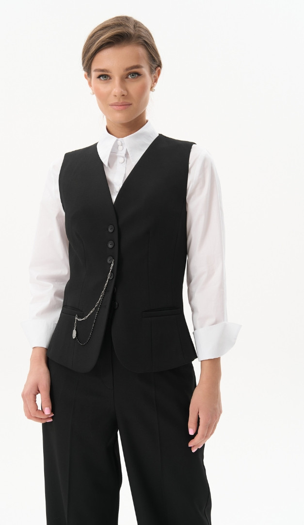 Жилет на пуговицах черный, безусловно, найдет свое место в базовом гардеробе. Модель прилегающего кроя, горловина оформлена V-образным вырезом, переходящим в удобную застежку на пуговицы. Спереди жилет на пуговицах черный дополнен двумя функциональными карманами. Лаконичность, универсальный цвет и минималистичный дизайн изделия позволят комбинировать его с практически любой блузкой, гольфом или топом. Модель на подкладке.