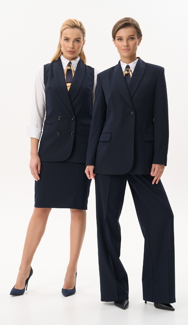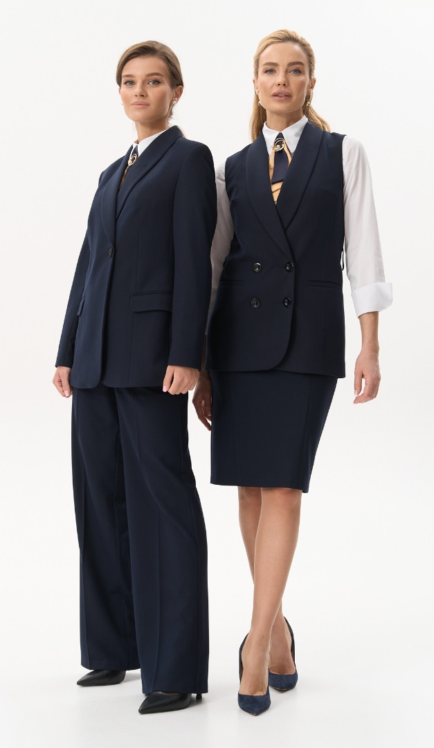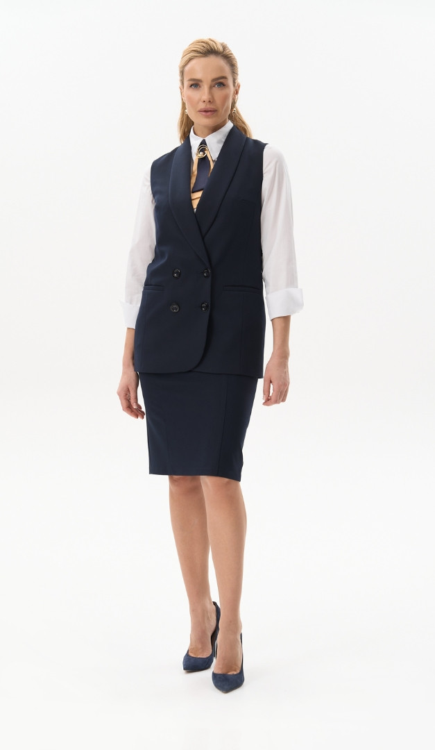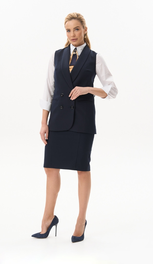 На фото создан образ с юбкой базовой синей (арт.4059) и блузкой базовой на пуговицах белой (арт.4068).