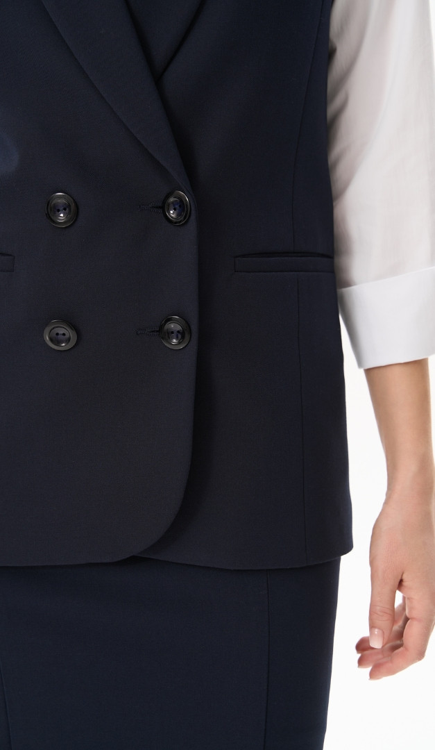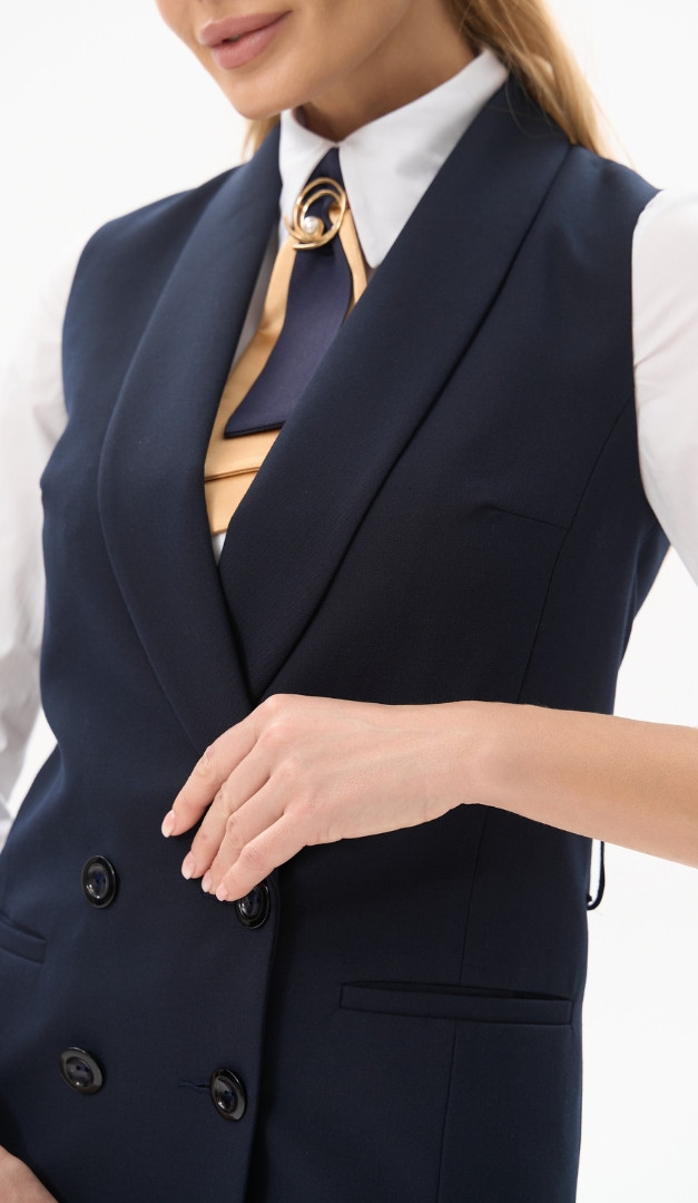 Женский женский удлиненный синий с поясом поможет создать стильный и при этом максимально комфортный образ. Прямой, слегка удлиненный крой придаст визуальной стройности силуэту. Вырез горловины в изделии элегантно оформлен шалевым воротником, переходящим в застежку на пуговицы. Также жилет женский удлиненный синий имеет внутренние функциональные карманы и съемный пояс. Модель изнутри на подкладке.