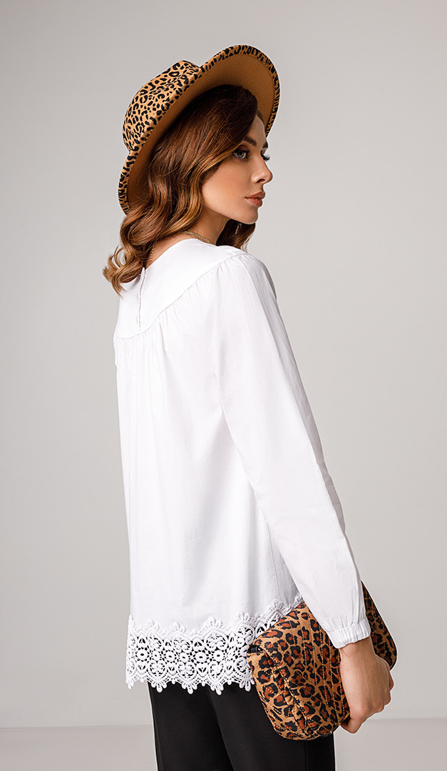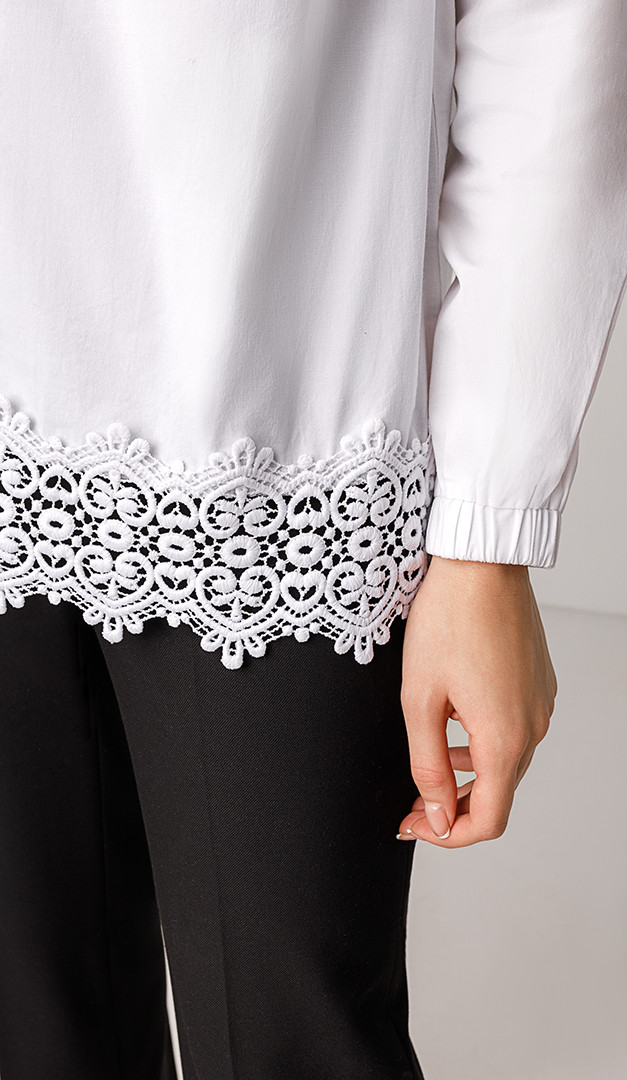 Блузка женская с кружевом белая — романтичный и тем самым необычный вариант классической блузки, который подойдет и для работы, и для торжественных мероприятий. Блузка женская с кружевом белая — невероятно женственная, а также очень удобная. Она имеет свободный прямой крой. Верх оригинально оформлен округлой кокеткой с мелкими складками. Длинный рукав по низу прибран на тонкую резинку. Застежка на пуговице расположена сзади на кокетке. Главное украшение блузки с кружевом белой — это эксклюзивное ажурное кружево, расположенное по низу изделия.