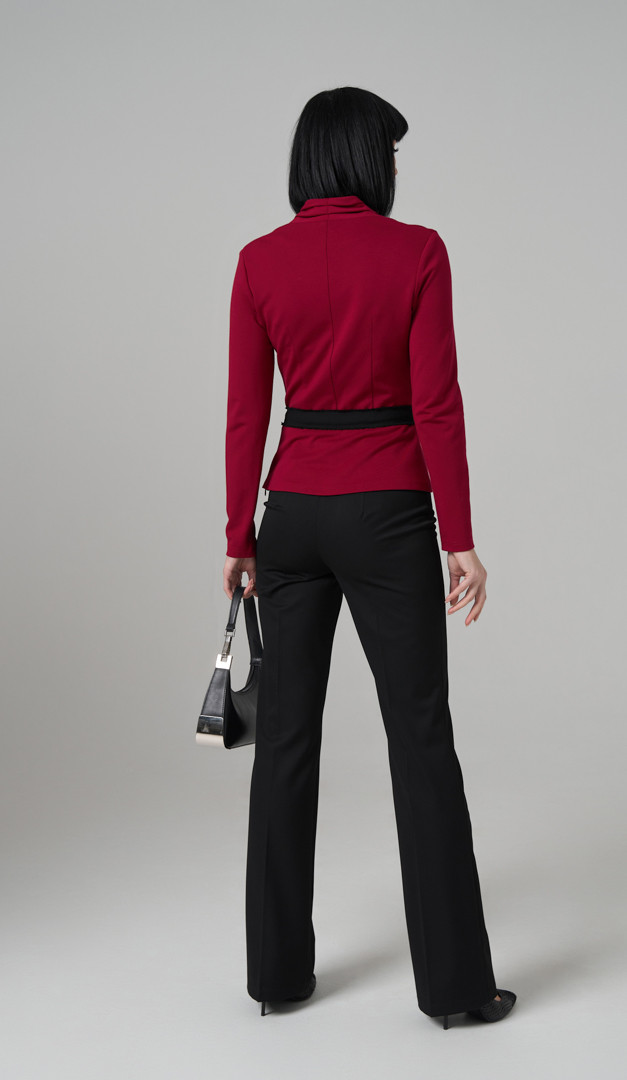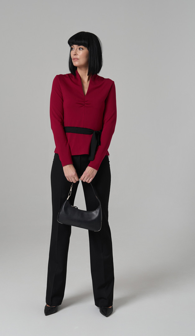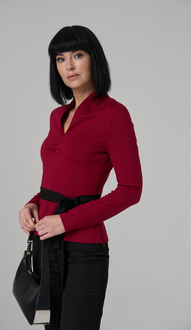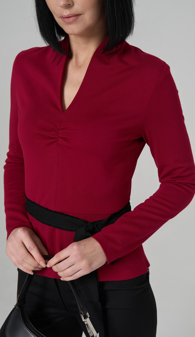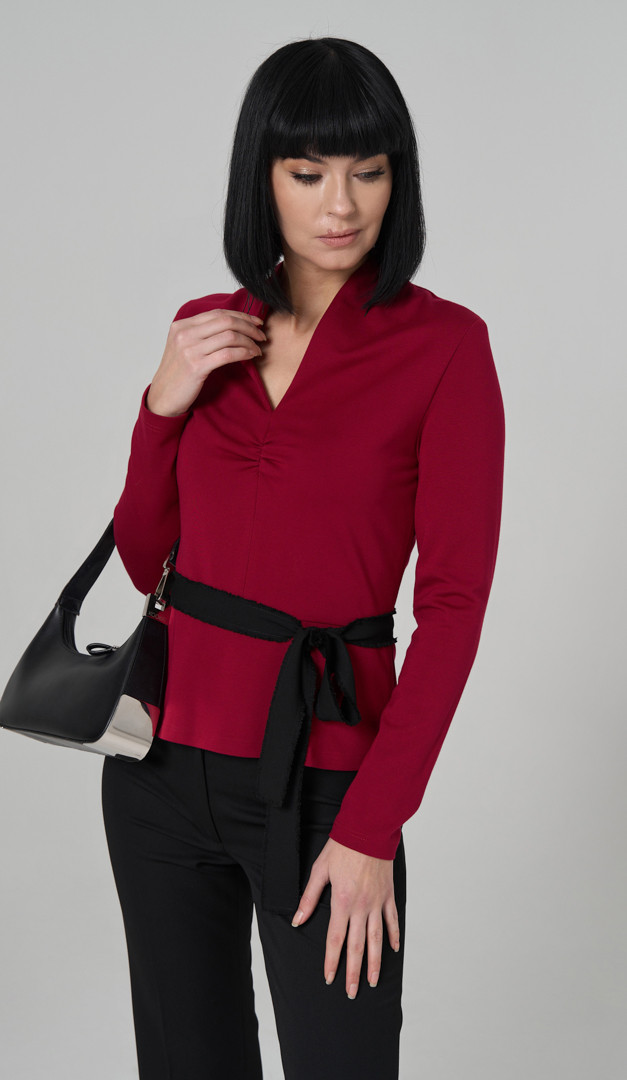 Блузон с поясом бордо – оригинальная вещь для базового женского гардероба. Модель, непременно, понравиться вам своей практичностью и универсальностью, так как сделана из мягкой трикотажной ткани в монохромном насыщенном цвете. Блузон с поясом бордо имеет удлиненный облегающий крой, слегка расширенный вниз и длинный рукав. Оригинальный V-образный вырез горловины с небольшой цельно кроеной стойкой и декоративными складками по центру визуально придают силуэту стройности. Линия талии изделия дополнена контрастным поясом, который крепится по одному из боковых швов, а в другом расположена потайная застежка-«молния».