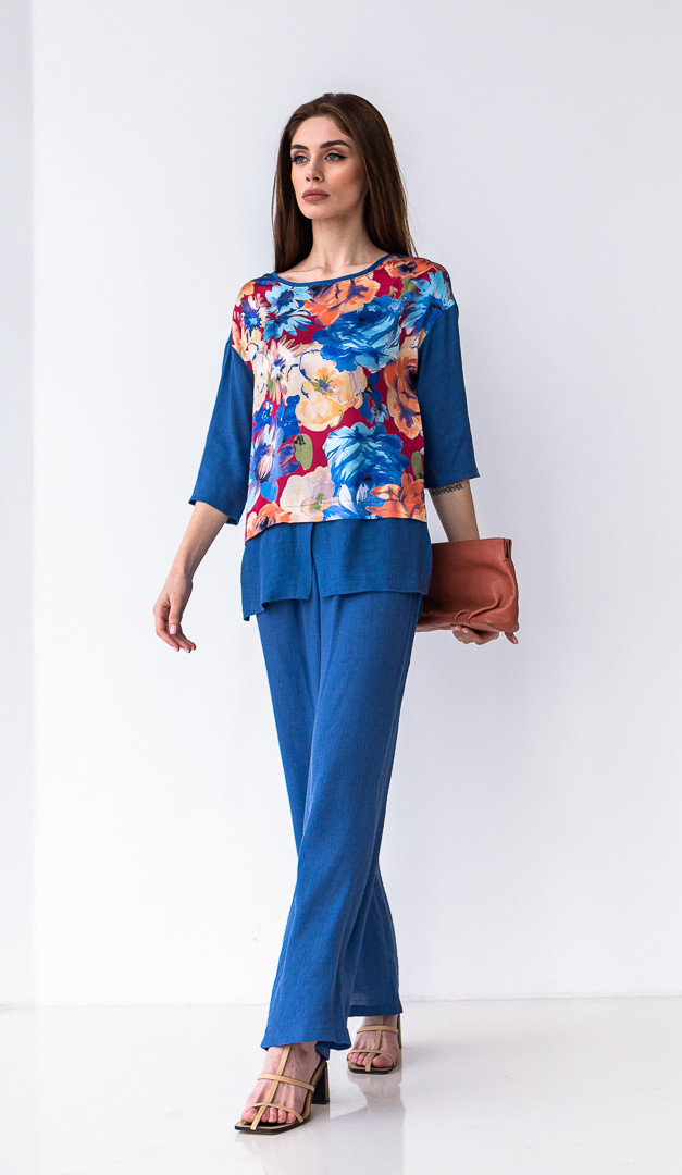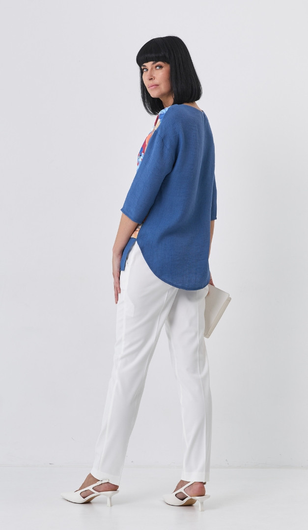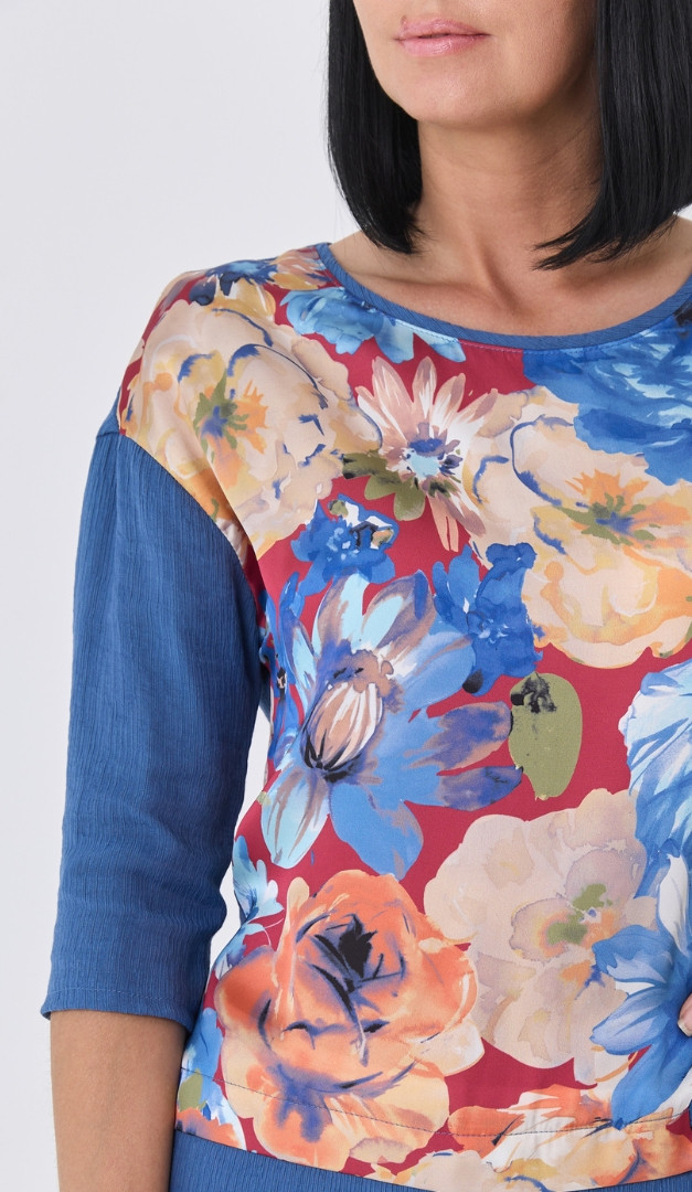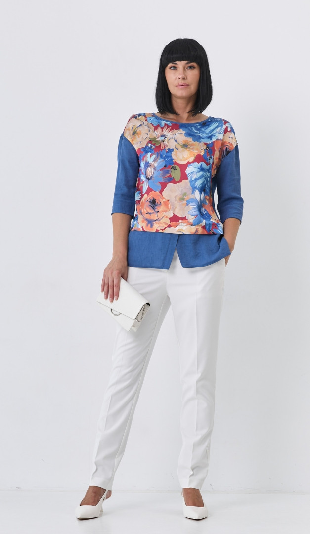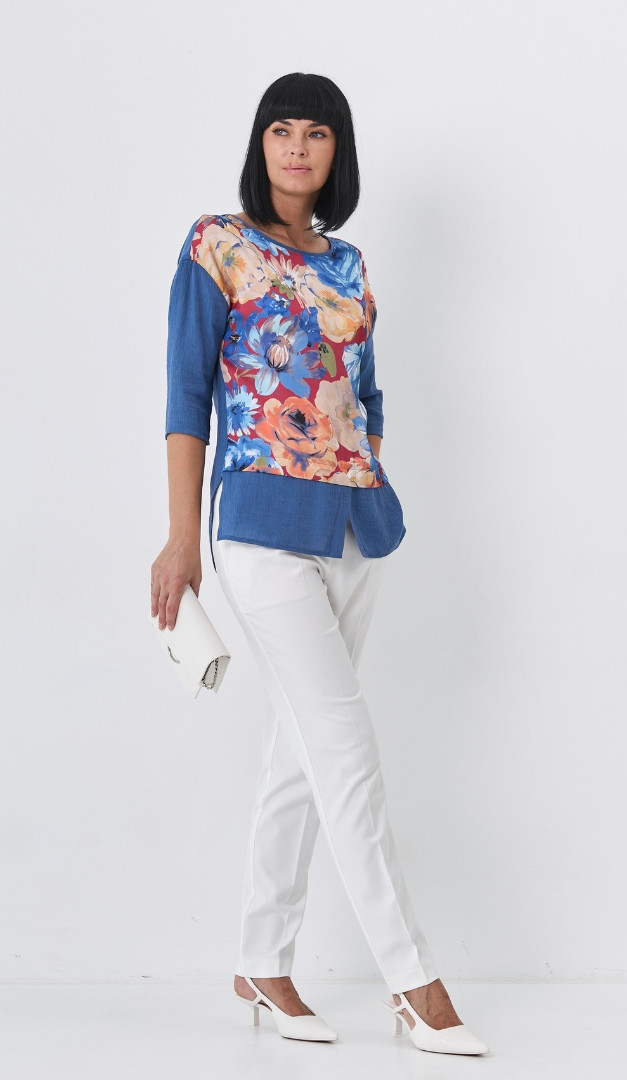Лаконичный и одновременно такой колоритный блузон! Идеальный для быстрых сборов на работу или на прогулку с друзьями. Блузон Сантарини имеет прямой свободный крой со стильно удлинённой спинкой. Неглубокий вырез горловины и цельно кроенный рукав «3/4» гарантируют вам комфорт. Благодаря вставке из ткани в оригинальные цветы любой образ станет ярче и эффектнее!