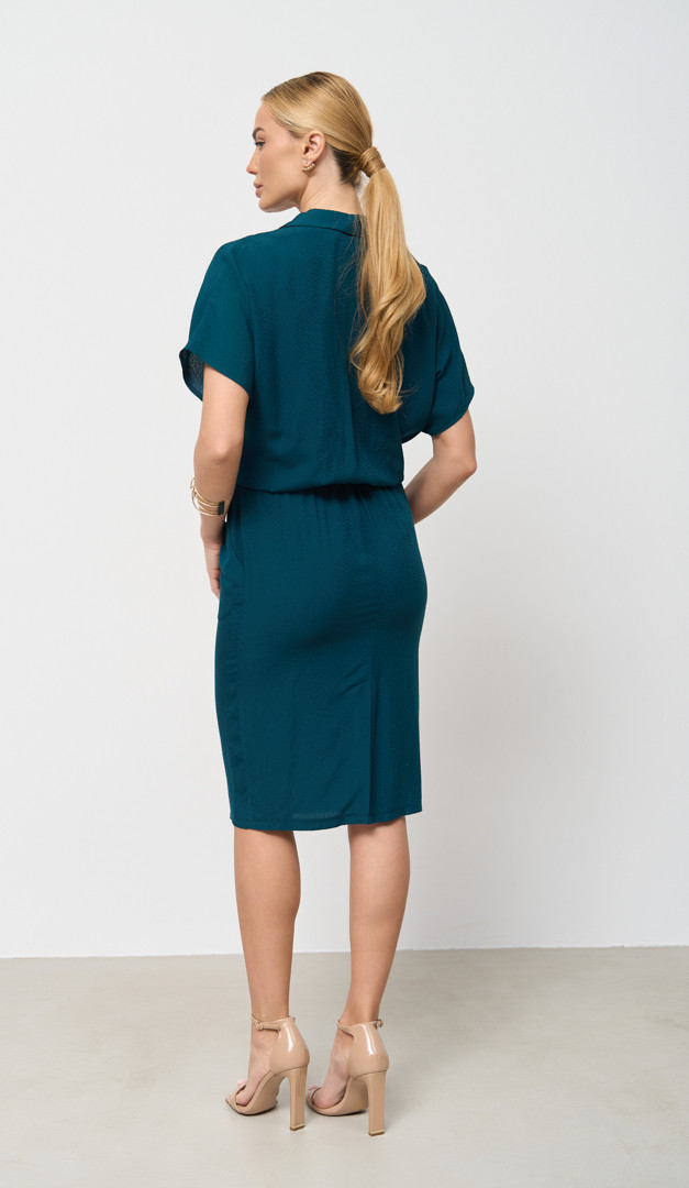 Легкое платье двухбортное изумрудное, выполненное в сдержанном классическом стиле, идеальное решение для офиса и для будней. Модель имеет элегантный прямой крой. Верх платья двухбортного изумрудного украшен фигурным отложным воротником, а также двумя рядами контрастных пуговиц, имитирующих застежку. Линия плеча прикрыта цельнокроенным свободным рукавом. На талии платье фиксируется внутренней резинкой и съемным поясом на петельках. Еще одна стильная деталь – внутренние боковые карманы. В среднем шве задней части расположена небольшая шлица. Без подложки.
