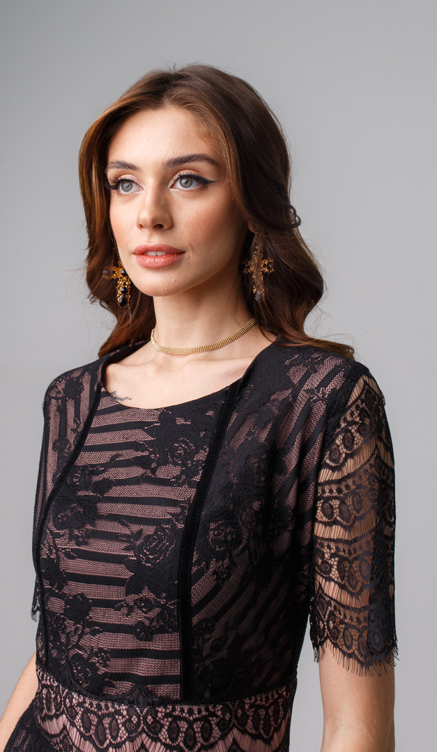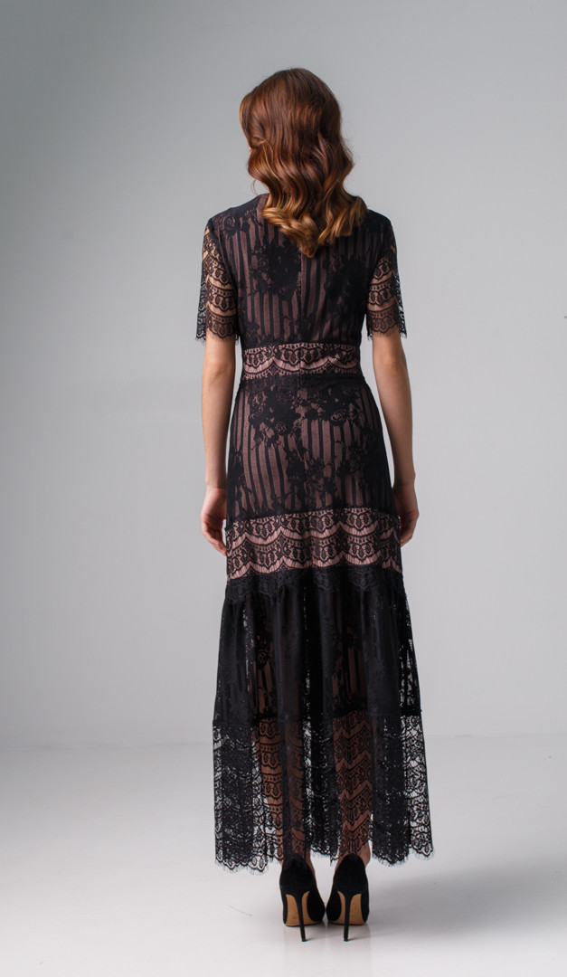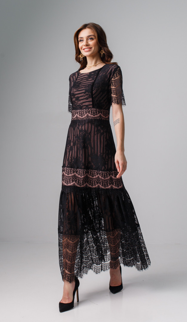 Платье макси из кружева черное — идеальный выбор для создания интригующего вечернего образа. К тому же эта модель очень комфортна, так как изнутри оформлена подкладкой из 95% вискозы! Платье макси из кружева черное имеет сдержанный А-образный силуэт с отрезной линией талии, от которой юбка романтично слегка расклешена. Несмотря на свою лаконичность, благодаря оригинальной комбинации кружев и мягко ниспадающего волана модель выглядит женственно и очень нарядно. В среднем шве задней части расположена застежка-молния.