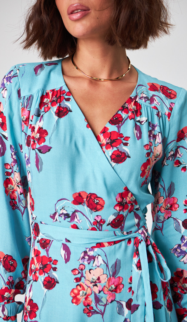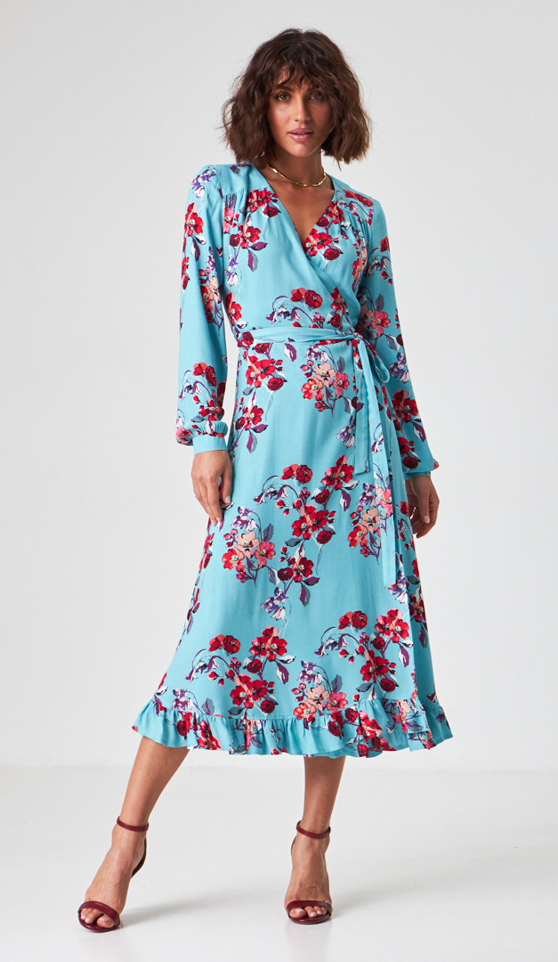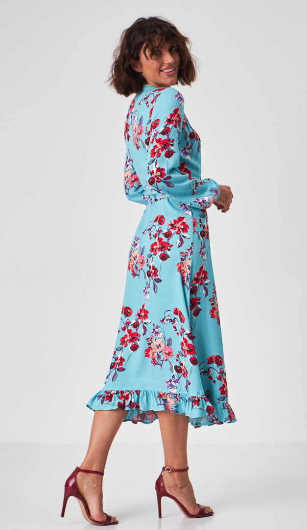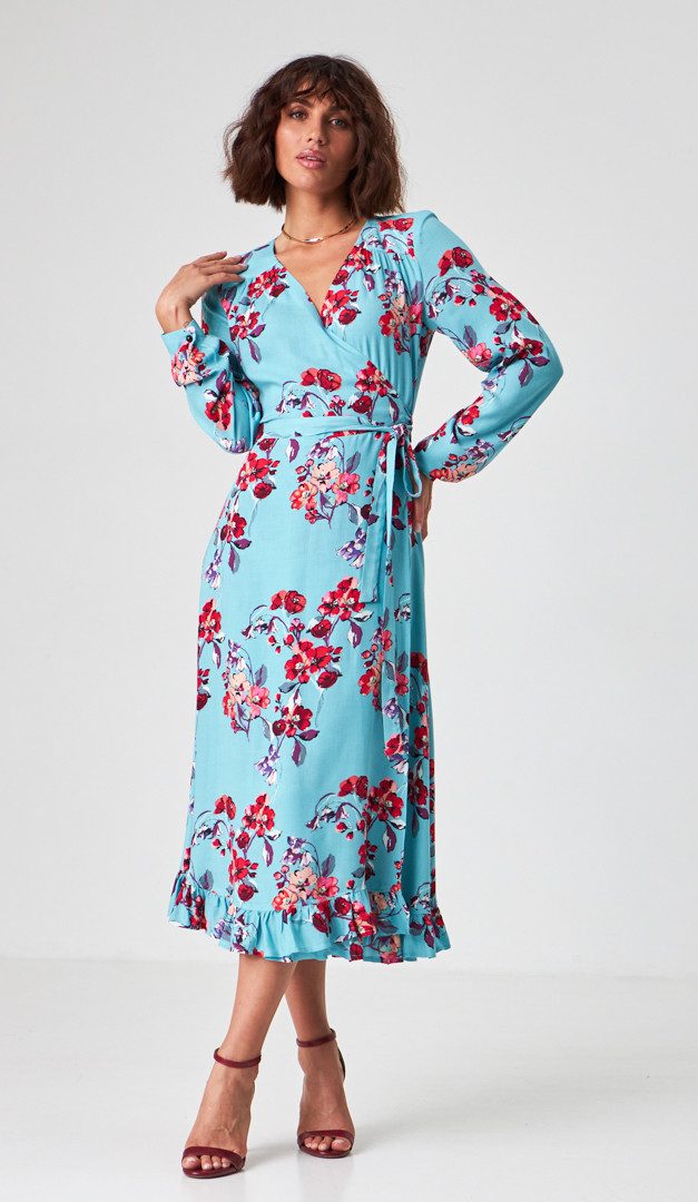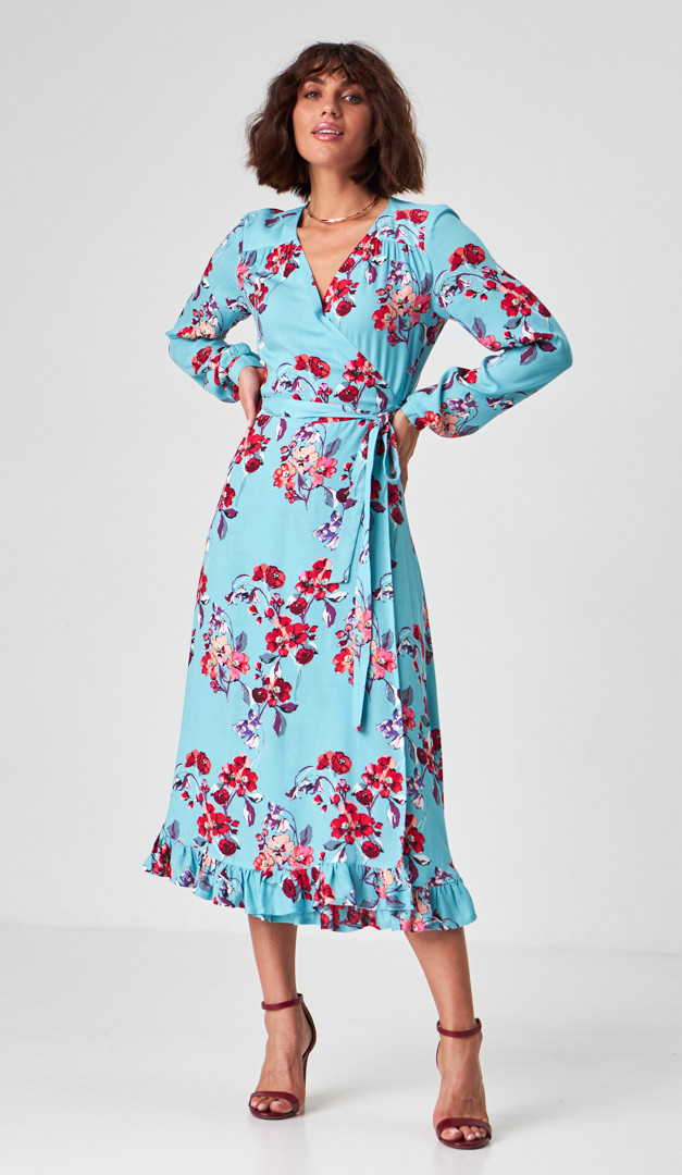 Платье миди в цветочный принт любой ваш выход сделает ярким и эффектным! Модель выполнена из мягкой струящейся вискозы. Трендовый крой "на запах" подойдет для всех типов фигуры и размеров! Аккуратный V-образный вырез горловины визуально стройнит силуэт. Платье миди в цветочный принт идеально для свиданий и торжественных событий, так как праздничных ноток придают длинные рукава на мажете, кокетливая распорка и красивый волан по низу. Для максимальной лёгкости платье выполнено без подкладки.