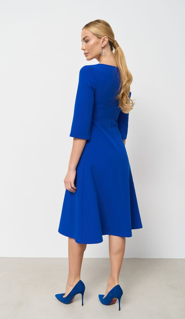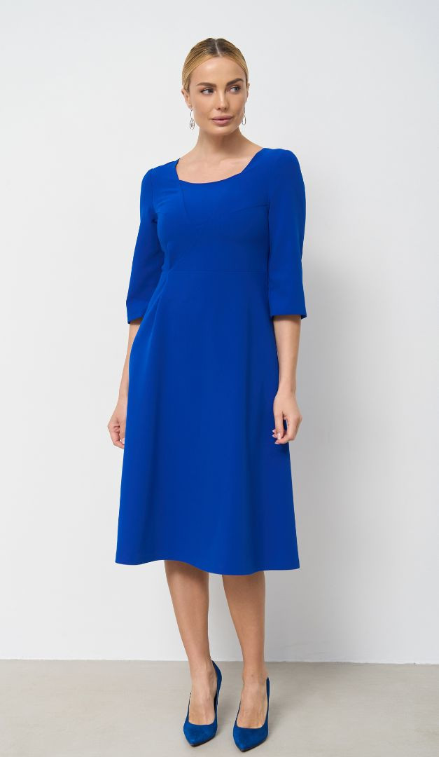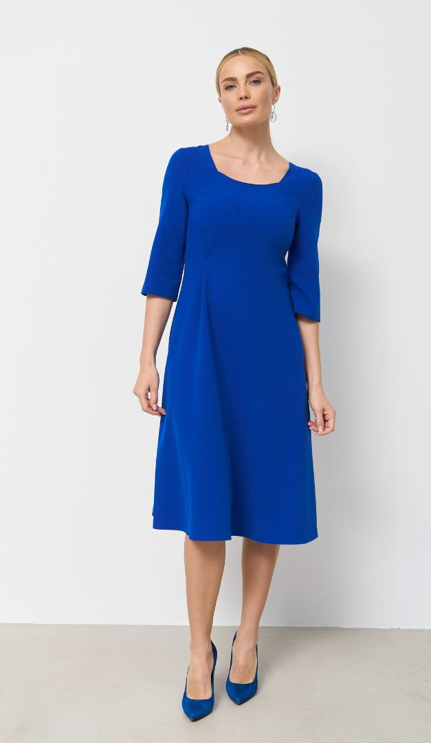 Базовое платье трапеция ультрамарин поможет создать сдержанный и женственный образ. Модель имеет практичный и универсальный для всех типов фигур А-силуэт – с слегка завышенной линией талии и расклешенной, мягко ложащейся юбочной частью. Более утонченно смотрится изделие благодаря облегающему верху с открытым вырезом горловины. Рукав – прямой, полуприлегающий, длиной «3/4». Платье трапеция ультрамарин застегивается на «молнию» в среднем шве задней части. Без подкладки.
