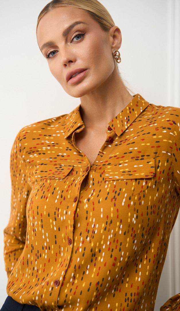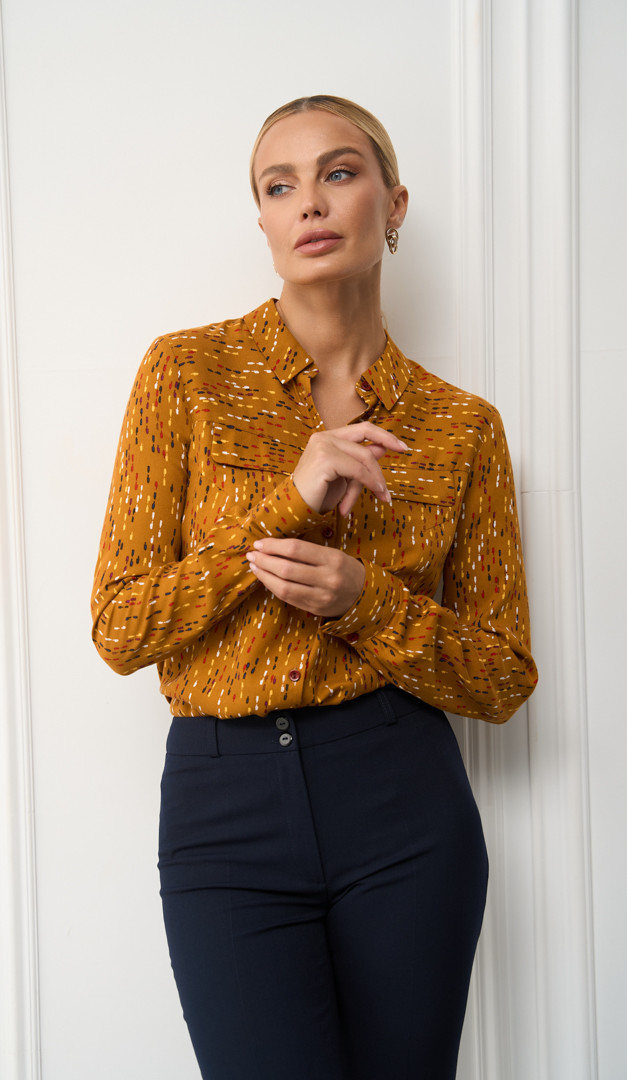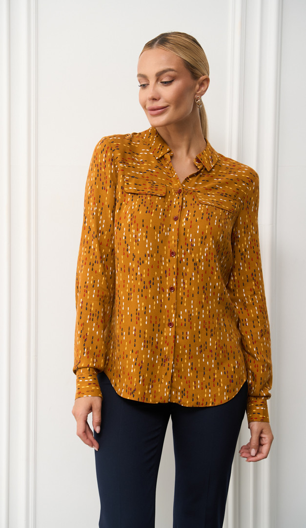 Рубашка женская в контрастный принт из 100% вискозы идеальна для офиса и неординарных деловых look-ов. Ещё одно её преимущество — это прямой свободный силуэт, комфортный и подходящий для разных типов фигуры. Рубашка женская в контрастный принт имеет классический отложной воротник на стойке, гармонично сочетающийся, с декоративными клапанами, имитирующими карманы. Длинный рукав на манжете застёгивается на пуговицу.
