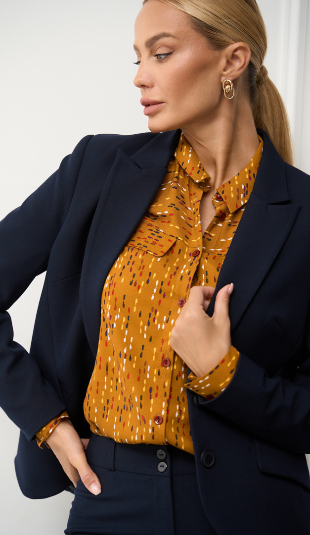 На фото создан образ с брюками клеш синими (арт.1973) и классическим жакетом синим (арт.2117).