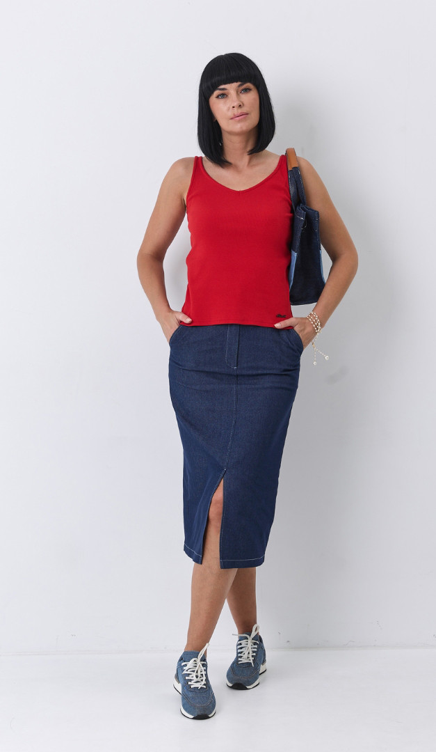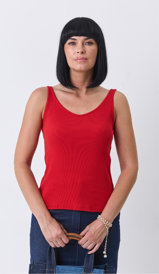 Локаничный, но такой соблазнительный базовый топ в рубчик в насыщенно красном цвете придётся по душе любительницам ярких расцветок и эффектных образов! Топ изготовлен из эластичного, слегка тянущегося, структурного трикотажа в рубчик. Хлопок 97%. Облегающий крой топа изящно подчеркивает линии фигуры, идеально комбинируется с жакетами и кардиганами. А V-образный вырез горловины зрительно «вытягивает» силуэт.