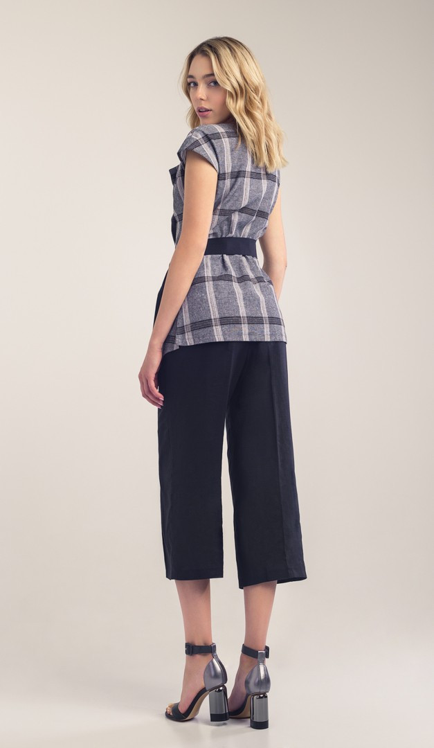 Неординарная вещь - жилет из льна в клеточку серый. Передняя двубортная часть модели оригинально оформлена фигурным лацканом. Жилет из льна в клеточку серый изнутри застёгивается на кнопки, а по линии талии фиксируется с помощью контрастного несъёмного пояса, который к тому же очень эффектно подчёркивает эту часть фигуры. Линия плеча слега удлинена.