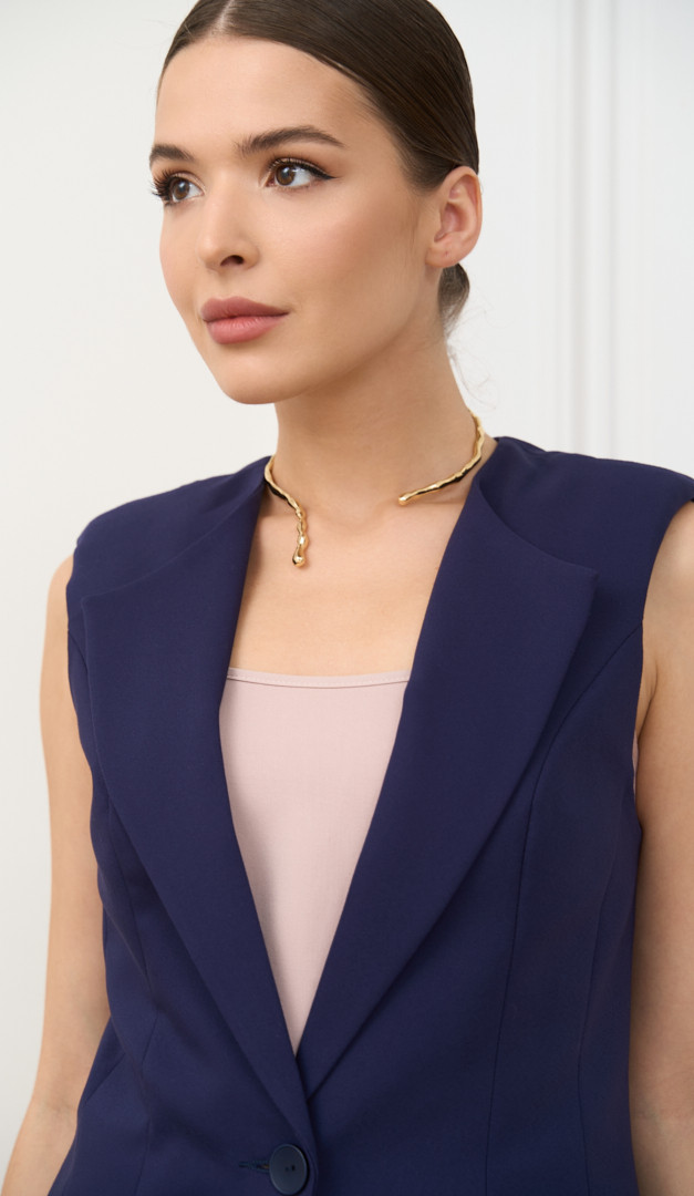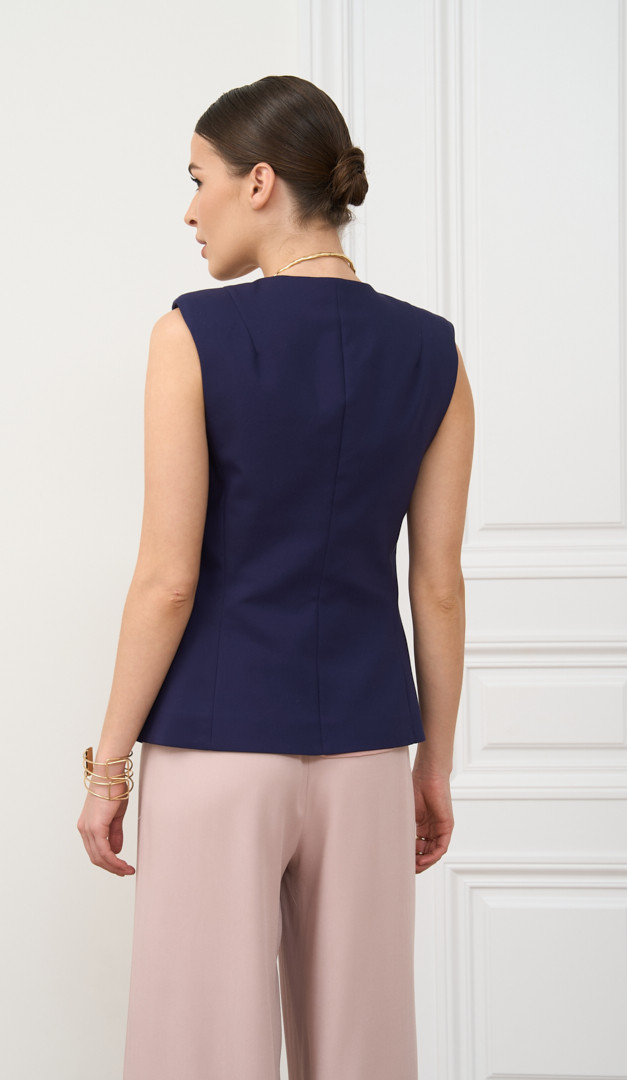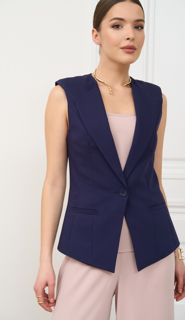 Женский женский синего цвета выполнен в классическом стиле, благодаря чему с легкостью дополнит любой деловой образ. Модель прилегающего кроя, с глубоким V-образным вырезом горловины, который оформлен фигурным воротником с отложными лацканами, переходящим в застежку на одну пуговицу. Спереди жилет женский синего цвета дополнен практичными функциональными карманами. Изнутри – на подложке из 100% вискозы.