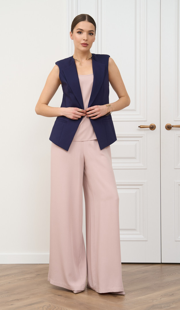 На фото создан образ с брюками палаццо пудровыми (арт.2859) и топом на тонких бретелях пудровым (арт.2860).