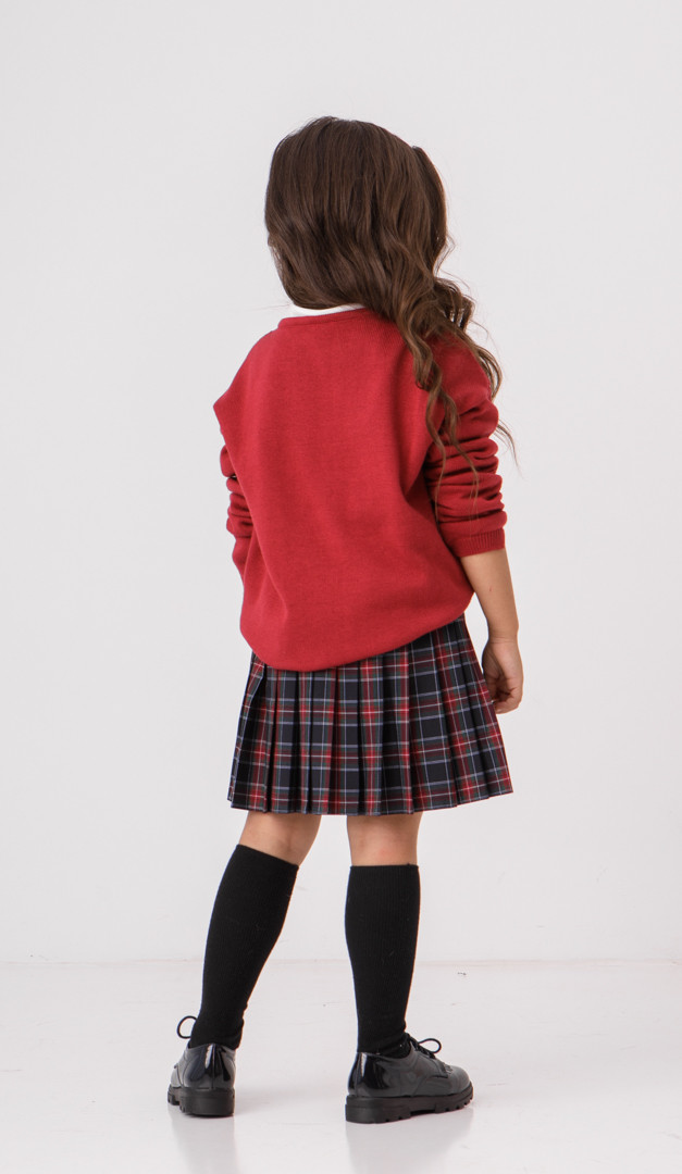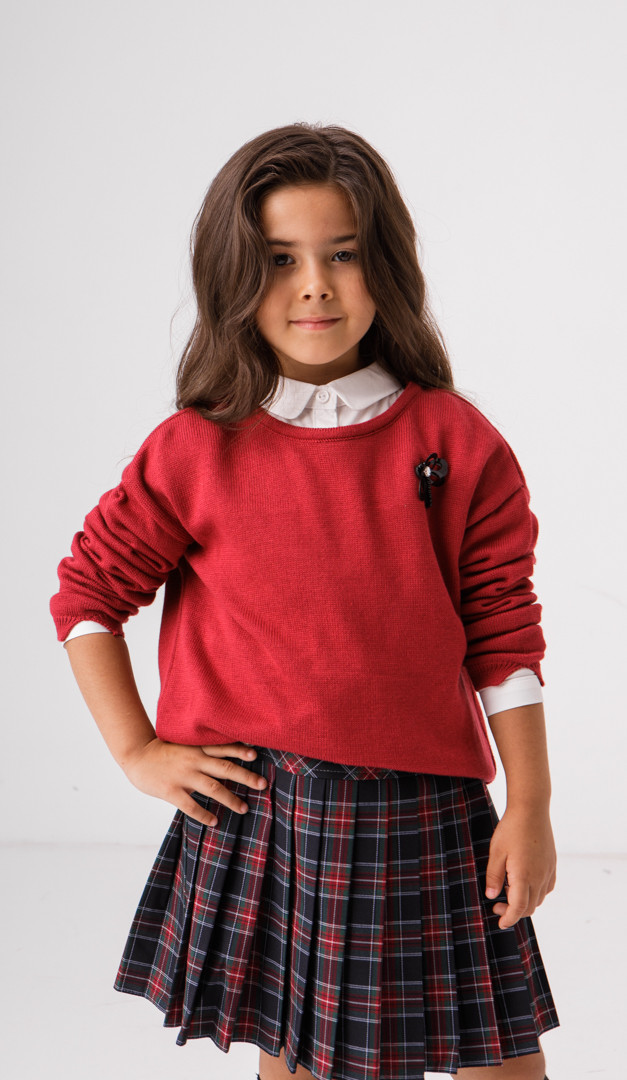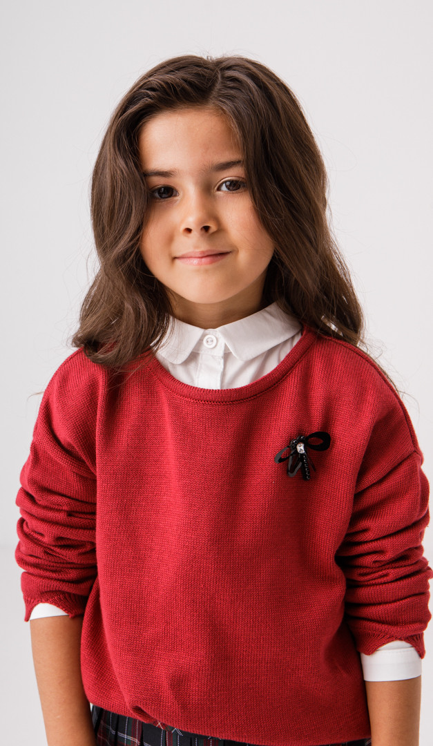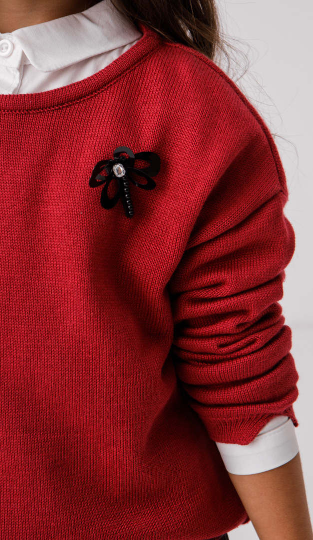 Джемпер для девочки бордовый — красивая и очень нужная вещь в гардеробе школьницы. Она не только стильно дополнит образ, а ещё подарит тепло и комфорт. Модель имеет свободный прямой силуэт со стильно удлинённой задней частью. Низ джемпера и низ манжет оформлен эластичной планкой. Ещё одна деталь, которая непременно приглянется каждой моднице — это милая декоративная брошка.