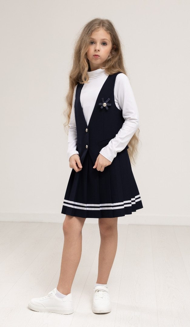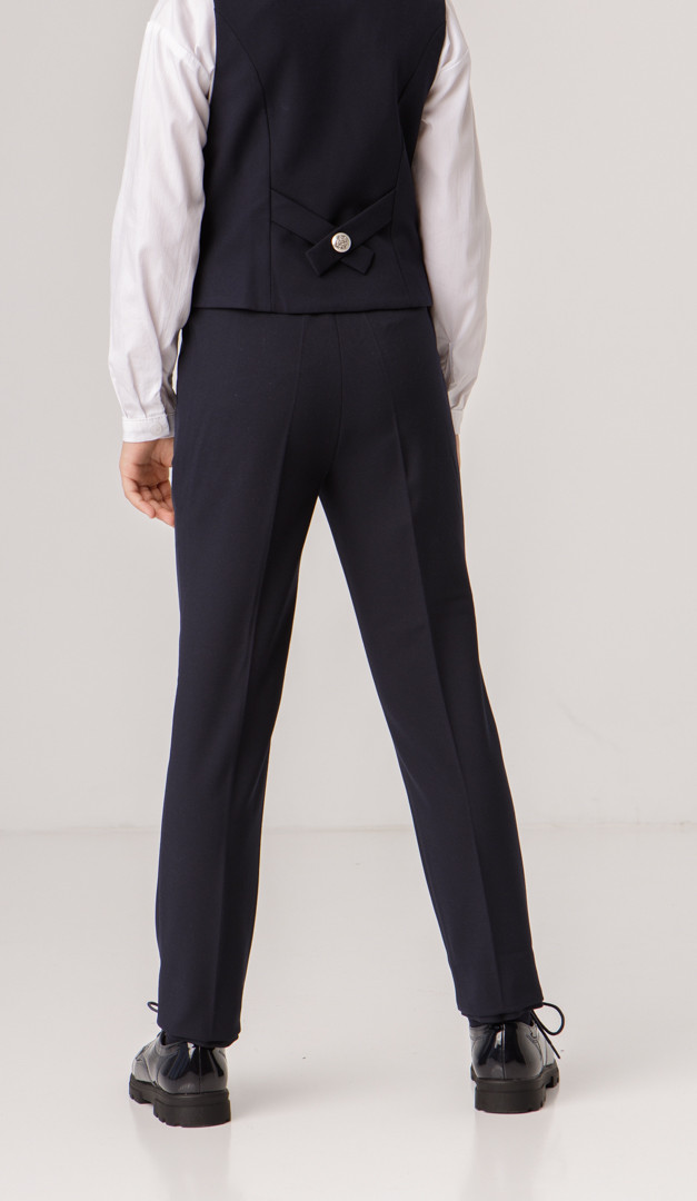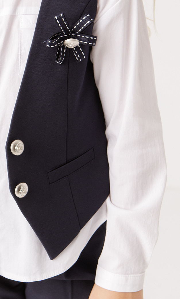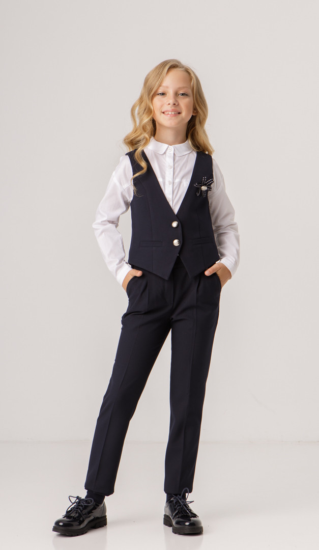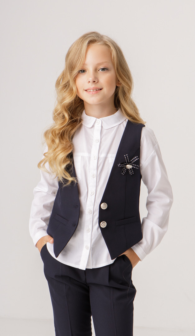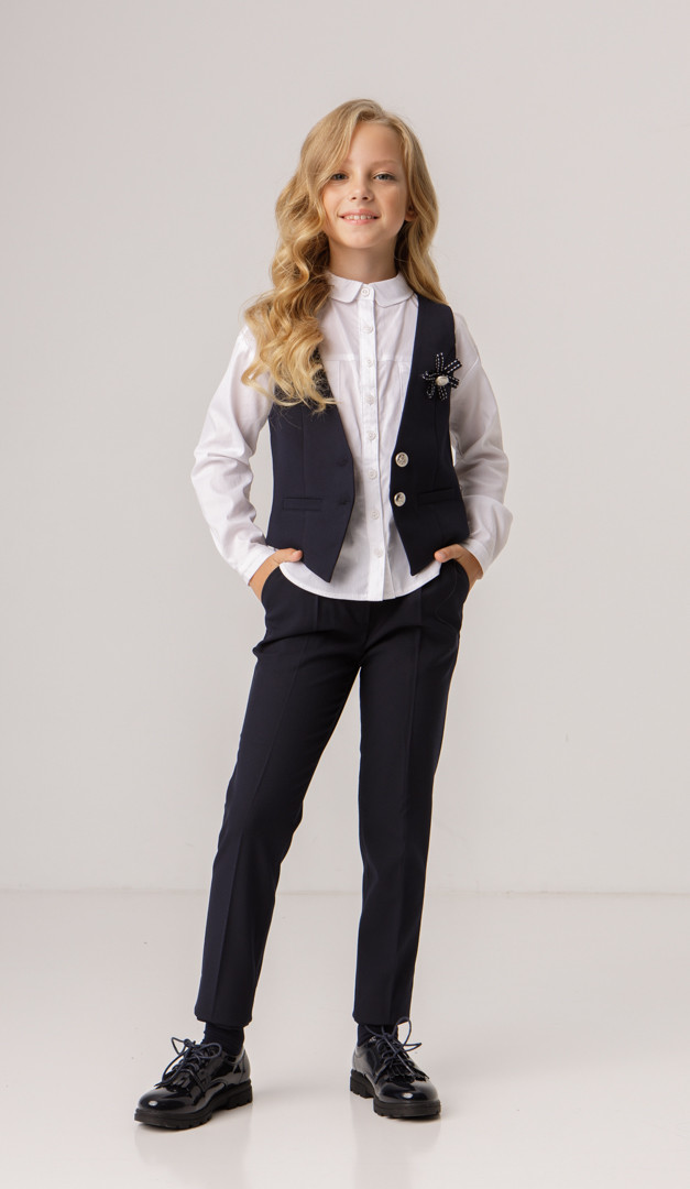 Стильная жилетка на пуговицах элегантного кроя гармонично дополнит дресс-код модной школьницы. Эта модель имеет изящный V-образный вырез горловины, красиво сочетающийся с фигурным низом. Жилетка застёгивается на две пуговицы. Чтобы модель смотрелась более нарядной, мы ее дополнили съёмной брошью, а также планками, имитирующими карманы, а спинку — декоративным хлястиком по линии талии. Изнутри жилетка оформлена атласной подкладкой.