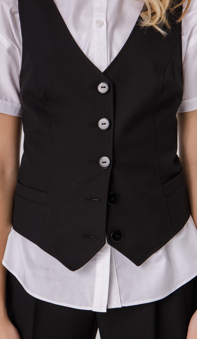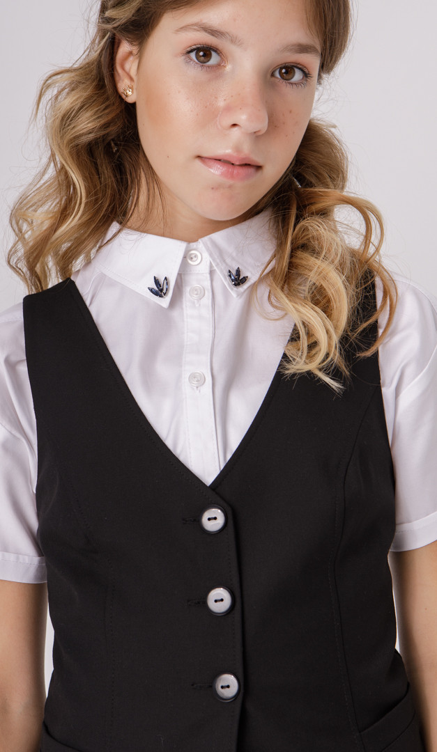 Стильная интерпретация классической жилетки — отличный вариант для школьного гардероба юной леди! Модель имеет углублённый V-образный вырез, плавно переходящий в застёжку на пуговицы. Эффектному и удобному прилеганию изделия способствуют расположенные по полочке фигурные рельефы. Такие детали, как вшитые функциональные карманы и фигурный низ, делают жилетку более кокетливой и оригинальной. По спинке модели расположены шлейки, длину которых в зависимости от роста, можна регулировать с помощью пуговиц. Также задняя часть изделия фиксируется с помощью центральной вставки из вшитых мелких резинок. Передняя часть жилетки на атласном подкладе.